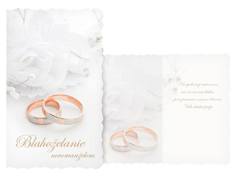 Svadobné blahoželanie s textom. Urobte radosť novomanželom a venujte im blahoželanie k ich zväzku, vďaka ktorému si vždy pripomenú krásne začiatky ich manželstva. Text na prednej strane blahoželania: Blahoželanie novomanželom Text vo vnútri blahoželania: Na spoločnej ceste životom nech Vás sprevádza láska, porozumenie a vzájomná dôvera. Veľa šťastia praje Papier: pohľadnicový kartón 240 g Želanie ja balené vo vrecúšku, súčasťou balenia je listová obálka. Uvedená cena je za 1 ks.
