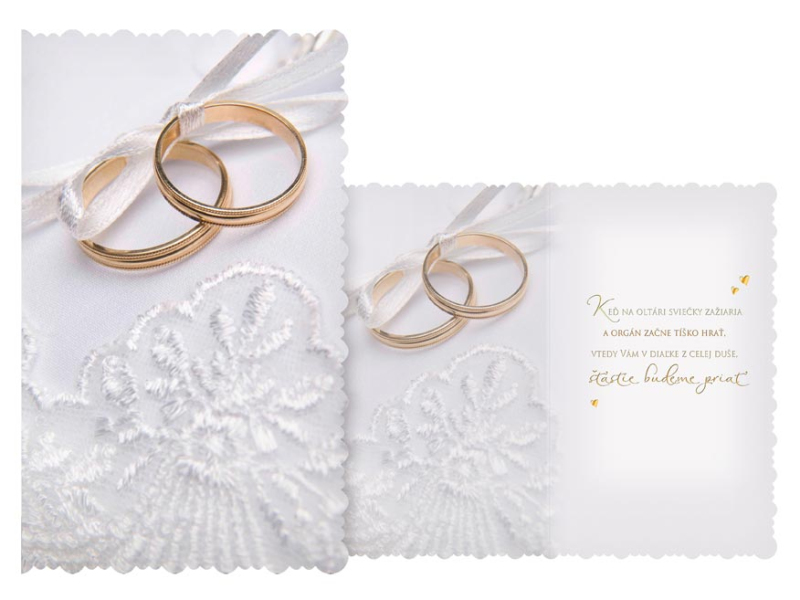 Svadobné blahoželania. Svadba je príjemná a mimoriadna udalosť a je začiatkom novej etapy života. Medzi svadobnými darmi by nikdy nemalo chýbať aj blahoželanie novomanželom. Urobte radosť novomanželom a venujte im blahoželanie k ich zväzku, vďaka ktorému si vždy pripomenú krásne začiatky ich manželstva. Text na prednej strane blahoželania: Bez textu Text vo vnútri blahoželania: Keď na oltári sviečky zažiaria a organ začne tíško hrať, vtedy Vám v diaľke z celej duše, šťastie budeme priať Papier: pohľadnicový kartón 240 g Želanie ja balené vo vrecúšku, súčasťou balenia je listová obálka. Uvedená cena je za 1 ks.