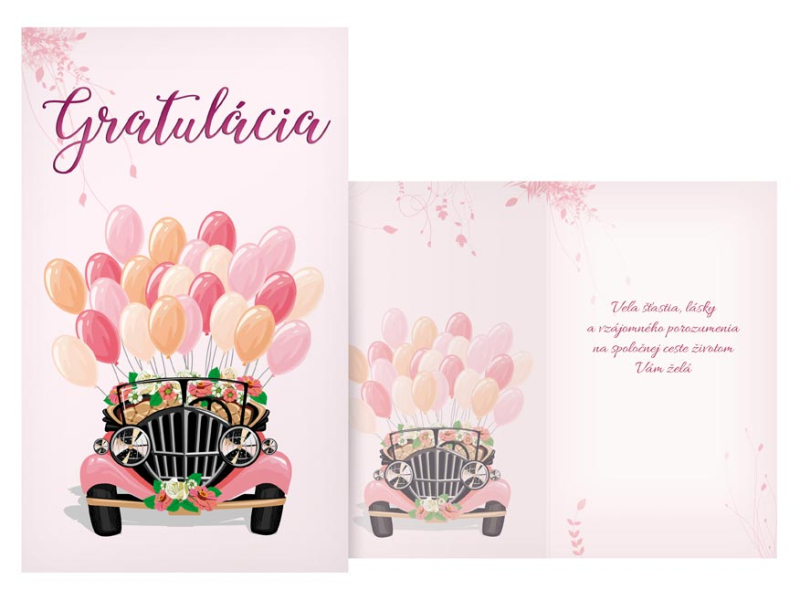 Svadobné blahoželania. Svadba je príjemná a mimoriadna udalosť a je začiatkom novej etapy života. Medzi svadobnými darmi by nikdy nemalo chýbať aj blahoželanie novomanželom. Urobte radosť novomanželom a venujte im blahoželanie k ich zväzku, vďaka ktorému si vždy pripomenú krásne začiatky ich manželstva. Text na prednej strane blahoželania: Gratulácia Text vo vnútri blahoželania: Veľa šťastia, lásky a vzájomného porozumenia na spoločnej ceste životom Vám želá Papier: pohľadnicový kartón 240 g Želanie ja balené vo vrecúšku, súčasťou balenia je listová obálka. Uvedená cena je za 1 ks.