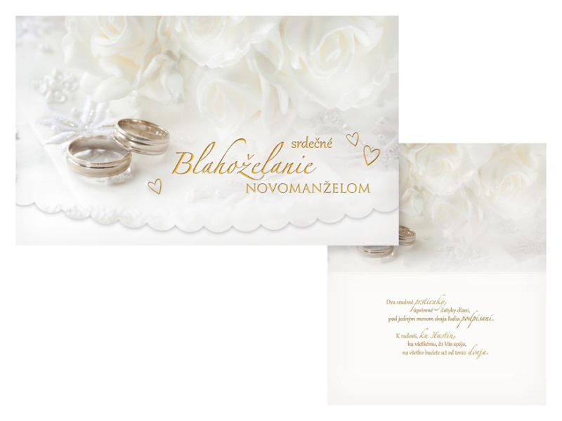 Svadobné blahoželania. Svadba je príjemná a mimoriadna udalosť a je začiatkom novej etapy života. Medzi svadobnými darmi by nikdy nemalo chýbať aj blahoželanie novomanželom. Urobte radosť novomanželom a venujte im blahoželanie k ich zväzku, vďaka ktorému si vždy pripomenú krásne začiatky ich manželstva. Text na prednej strane blahoželania: srdečné Blahoželanie NOVOMANŽELOM Text vo vnútri blahoželania: Dva snubné prstienky, úprimné dotyky dlaní, pod jedným menom dvaja ľudia podpísaní. K radosti, ku šťastiu, ku všetkému, čo Vás spája, na všetko budete už od teraz dvaja. Papier: pohľadnicový kartón 240 g Želanie ja balené vo vrecúšku, súčasťou balenia je listová obálka. Uvedená cena je za 1 ks. .