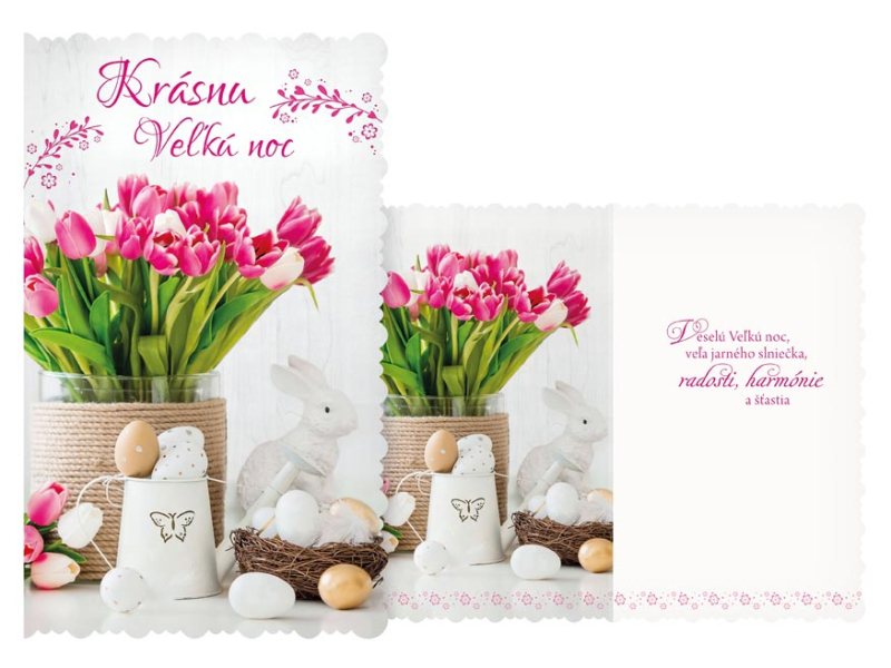 Krásna Veľká noc plná nežnosti! Toto blahoželanie je ako jarný sen plný farieb a harmónie. Bohatá kytica ružových tulipánov sa rozprestiera v elegantnej váze, symbolizujúcim jednoduchosť a krásu tradičnej Veľkej noci. Vedľa nej sa v nežnom svetle usmieva biely zajačik – symbol jari a nových začiatkov. Zdieľajte krásu jari a sviatočného pokoja – jedno malé prianie môže priniesť veľkú radosť! Text na prednej strane blahoželania: Krásnu Veľkú noc Text vo vnútri blahoželania: Veľa šťastia, pevné zdravie, spokojnosť a pohodu, šťastný život bez starostí a vždy dobrú náladu praje Papier: pohľadnicový kartón 240 g Želanie ja balené vo vrecúšku, súčasťou balenia je listová obálka. Uvedená cena je za 1 ks.