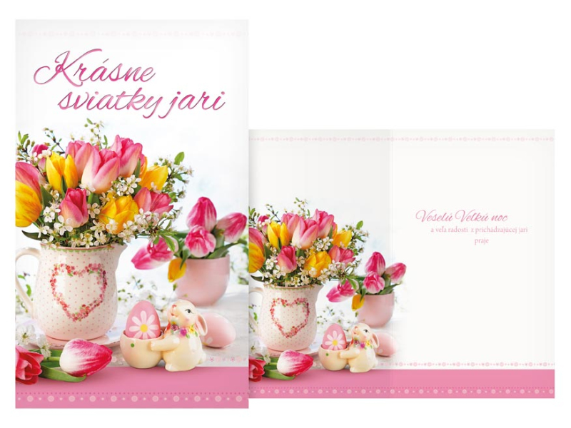 Veľkonočné blahoželanie s textom vo vnútri. Potešte svojich blízkych vkusným prianiam a poprajte im krásne sviatky jari. Text na prednej strane pohľadnice: Krásne sviatky jari Text vo vnútri: Veselú Veľkú noc a veľa radosti z prichádzajúcej jari praje Papier: pohľadnicový kartón 240 g Pohľadnica je balená vo vrecúšku, súčasťou je i listová obálka. Uvedená cena je za 1 ks.