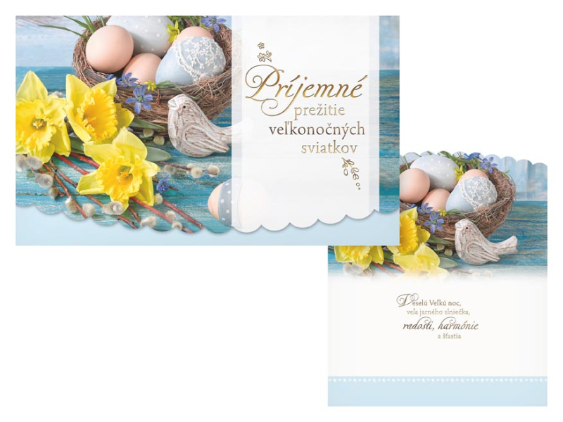 Veľkonočné blahoželanie s textom vo vnútri. Potešte svojich blízkych vkusným prianiam a poprajte im krásne sviatky jari. Text na prednej strane pohľadnice: Príjemné prežitie veľkonočných sviatkov Text vo vnútri: Veselú Veľkú noc, veľa jarného slniečka, radosti, harmónie a šťastia Papier: pohľadnicový kartón 240 g Pohľadnica je balená vo vrecúšku, súčasťou je i listová obálka. Uvedená cena je za 1 ks.