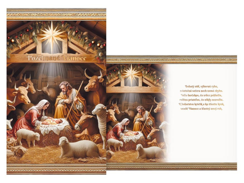 Bohatý stôl, výbornú rybu, sviatočná večera nech nemá chybu. Veľa darčekov, čo srdce pohladia, rodinu priateľov, čo nikdy nezradia. K bohatstvu krôčik a ku šťastiu krok, veselé Vianoce a šťastný Nový rok.