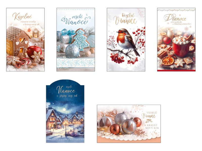 Vianočné blahoželanie s textom. Nezabudnite poslať krásne Vianočné prianie Vašim známym. Určite ich poteší to, že ste si na ne spomenuli. Papier: pohľadnicový kartón 240 g Prianie je balené v sáčku, súčasťou balenia je aj listová obálka. Uvedená cena je za 1 ks.