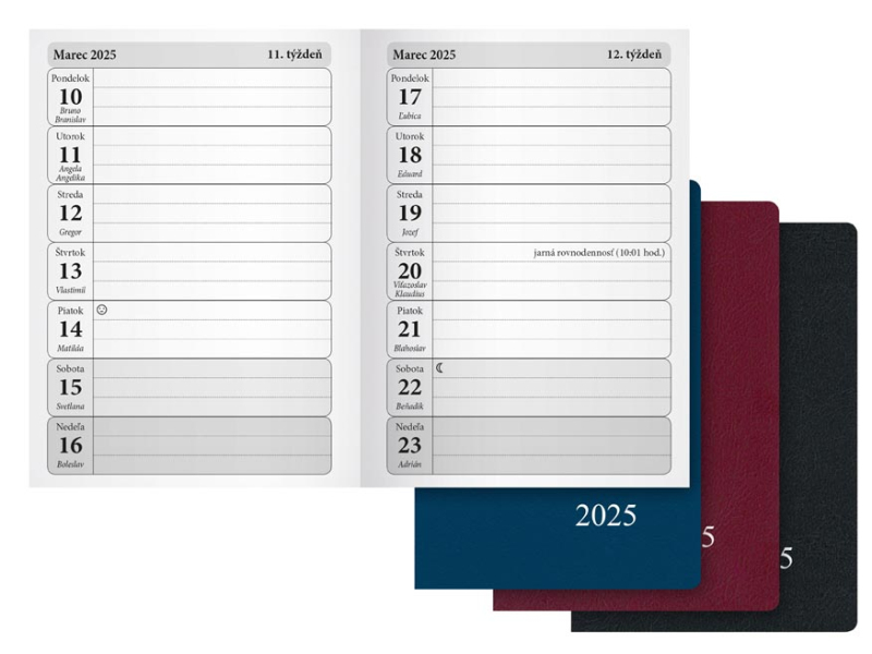 Týždenný diár 2025. Zaobstarajte si diár, ktorý je výborným pomocníkom pre organizovanie Vášho času. DIÁR OBSAHUJE: - ročný prehľad roka - štátne sviatky a významné dni - plánovací kalendár - 2 strany pre poznámky - abecedný zoznam mien - menné kalendárium - cudzie jednotky a meny - číslovanie týždňov - fáza mesiaca - letný a zimný čas Povrch: PVC Počet strán: 72 Väzba: zošitová V1 Kalendárium: týždenný Rozmer: 90 x 125 mm Farba: modrá, bordová, čierna Dodávame v mixe 3 farieb podľa skladovej zásoby. Uvedená cena je za 1 ks.