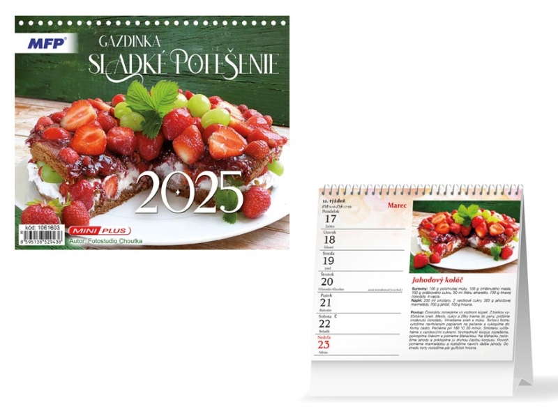 Stolový mini kalendár na rok 2025 s názvom Gazdinka - Sladkej potešenie. Vhodný pre zapisovanie dôležitých poznámok, k organizovaniu rôznych udalostí každodenného života. Milovníci sladkých dezertov, zákuskov a pohárov si prídu na svoje. Nájdete tu fotky a recepty dezertov, ktoré sú chutné a zvládne ich každý. „Naháňa Vás maškrtnosť?“ Osladte si život, inšpriujte sa z radov receptov a upečte si lahodný dezert. Pod každou fotkou je postup receptu. Možnosť dotlače firemného loga a textu na spodnej strane kalendáru. TYP KALENDÁRA: stolový OBRÁZKY: chutné dezerty, zákusky, torty, nákypy, koláče V KALENDÁRI NÁJDETE: - prehľad roku 2025 - malý kalendár roku 2026 - plánovací kalendár 2025 - štátne sviatky, meniny - názvy a fázy mesiaca, počet týždňov v roku - časy východu a západu Väzba: vinutá špirála Rozmer: 170 x 145 mm Kalendárium: týždenný Uvedená cena je za 1 ks.