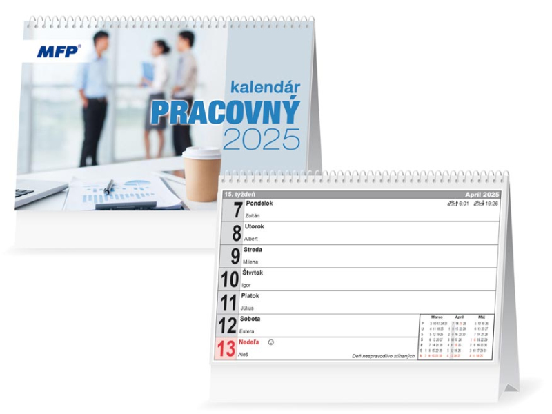 Pracovný stolový kalendár na rok 2025. Vhodný pre zapisovanie dôležitých poznámok, k organizovaniu rôznych udalostí každodenného života. Možnosť dotlače firemného loga a textu na spodnú stranu kalendára. TYP KALENDÁRA: stolový OBRÁZKY: nie sú V KALENDÁRI NÁJDETE: - štátne sviatky, významné dni - priestor na poznámky - malý prehľad roku 2025, 2026 - plánovací kalendár 2025 - meniny - názov mesiaca - slnovraty - počet týždňov Väzba: vinutá špirála Kalendárium: týždenný Rozmer: 160 × 105 mm Uvedená cena je za 1 ks.