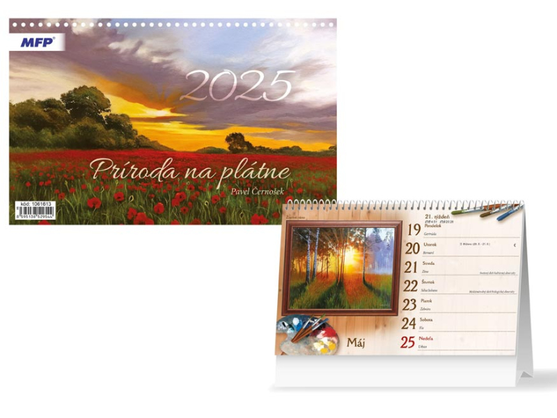 Stolový kalendár na rok 2025 s názvom Príroda na plátne. Nájdete v ňom nádherné obrazy krajiny, prírody, riek a jazier. Vhodné na organizovanie rôznych udalostí každodenného života. Možnosť vytlačiť logo a text vašej spoločnosti na spodnú časť kalendára TYP KALENDÁRA: stolový OBRÁZKY: maľby krajiny V KALENDÁRIU NAJDETE: - prehľad na rok 2025 - malý kalendár na rok 2026 - plánovací kalendár na rok 2025 - štátne sviatky, meniny - názvy a fázy mesiacov, počet týždňov v roku Kalendár: týždenný Väzba: spirálová väzba Uvedená cena je za 1 ks.