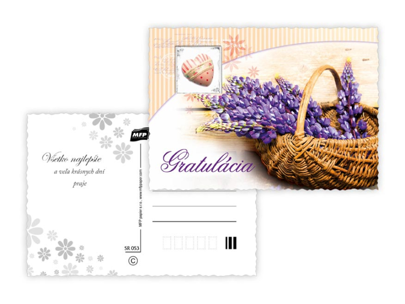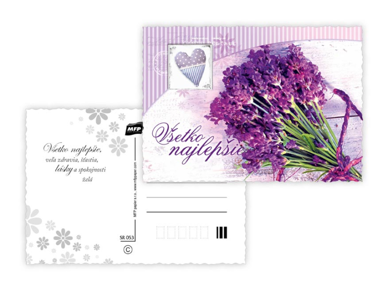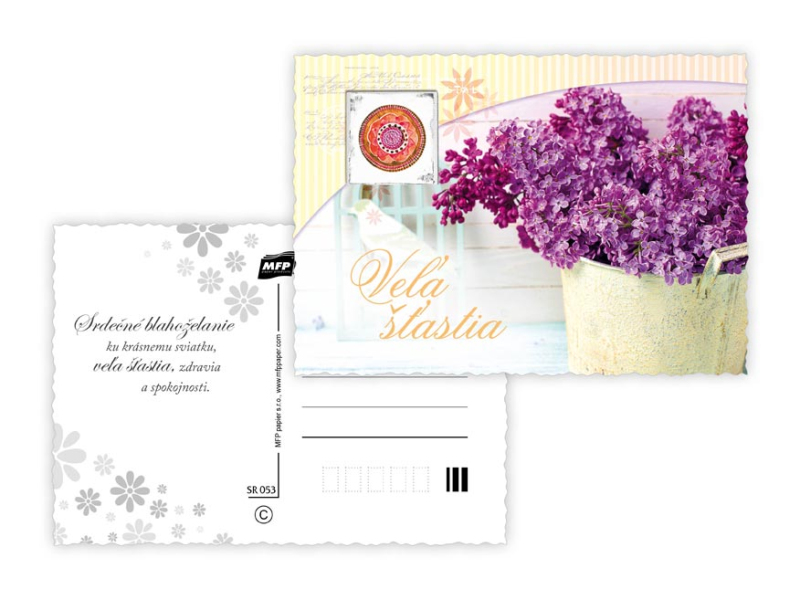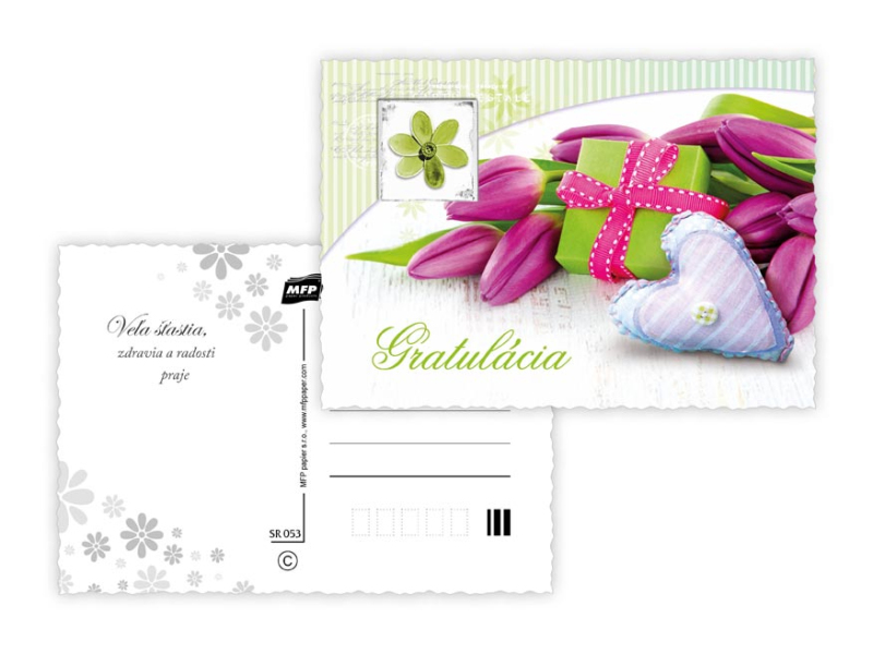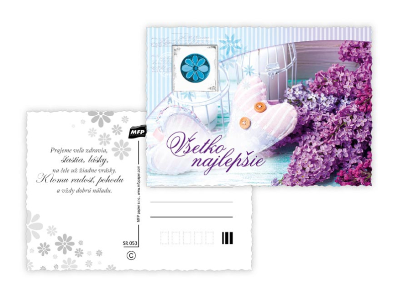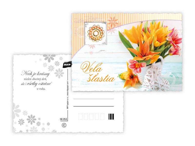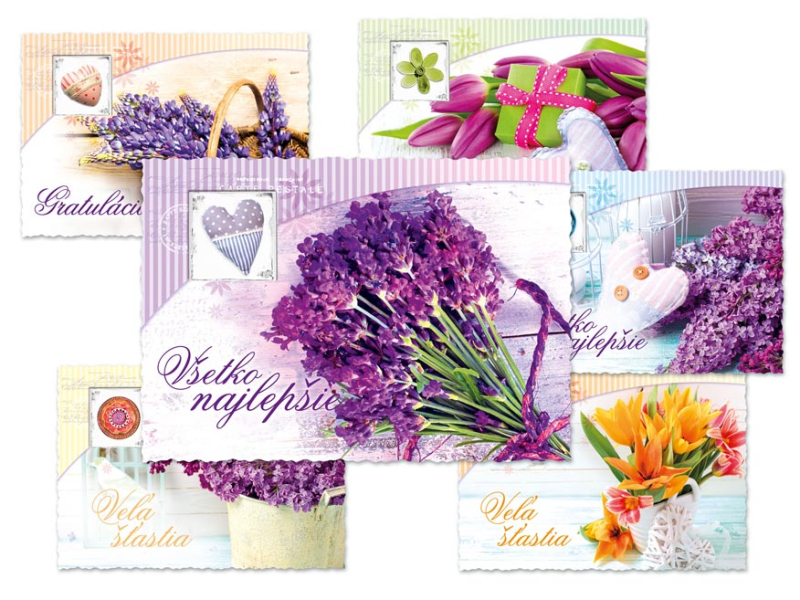 Srdečné blahoželania s výsekom a obrázkom kytíc. Text je na 6 pohľadniciach zo 6. Text na prednej strane: Všetko najlepšie, Gratulácia, Vel’a šťastia, Všetko najlepšie, Vel’a šťastia, Gratulácia Text na zadnej strane: Pohľadnica 1 : Všetko najlepšie, vel’a zdravia, šťastia, lásky a spokojnosti želá Pohľadnica 2: Všetko najlepšie a vel’a krásnych dní praje Pohľadnica 3: Srdečné blahoželanie ku krásnemu sviatku, vel’a šťastia, zdravia a spokojenosti Pohľadnica 4: Prajeme vel’a zdravia, šťastia, lásky, na čele už žiadne vrásky. K tomu radosť, pohodu a vždy dobrú náladu. Pohľadnica 5: Nech je krásny nielen dnešný deň, ale i všetky ostatné v roku. Pohľadnica 6: Vel’a šťastia, zdravia a radosti praje Papier: pohľadnicový kartón 240 g Povrchová úprava : bez laku s výsekom Text: 6/6 Dodávame v mixe motívov. Uvedená cena je za 1 ks.