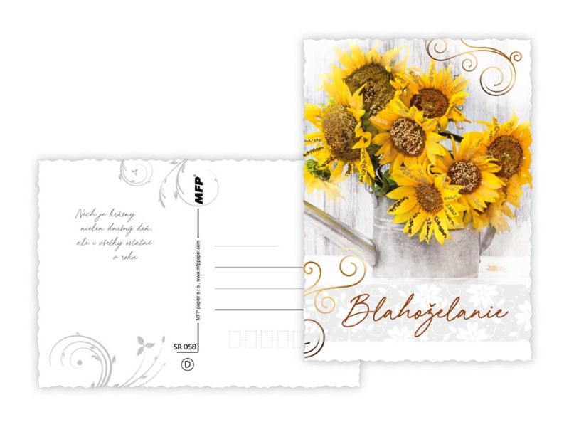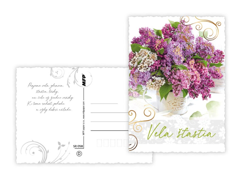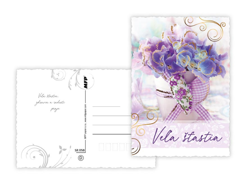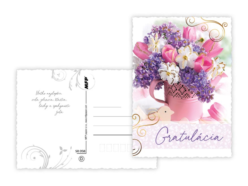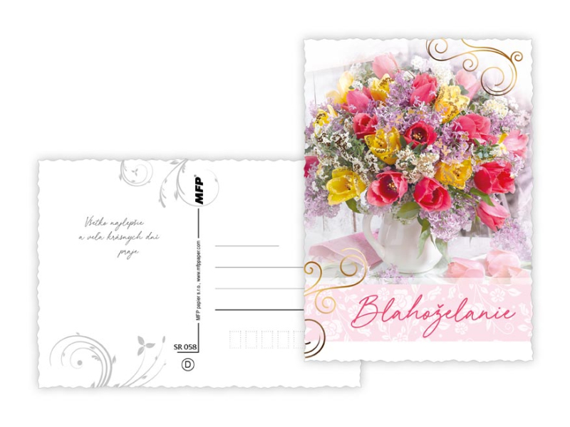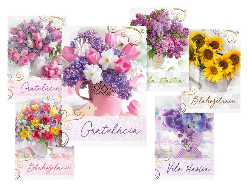 SK pohľadnica s obrázkami kvetín a vlnitým rámom. Text obsahuje na zadnej strane 6 pohľadníc zo 6. Text na prednej strane: Gratulácia, veľa šťastia, blahoželanie Text na zadnej strane: Pohľadnice 1: Srdečné blahoželanie ku krásnemu sviatku. Veľa šťastia a spokojnosti. Pohľadnice 2: Všetko najlepšie a veľa krásnych dní praje Pohľadnice 3: Všetko najlepšie. Veľa zdravia, lásky a spokojnosti praje Pohľadnice 4: Prajeme veľa zdravia, šťastia, lásky, na čele už žiadne vrásky. K tomu radosť, pohodu a vždy dobrú náladu. Pohľadnice 5: Nech je krásny a nielen dnešný deň, ale i všetky ostatné v roku. Pohľadnice 6: Veľa šťastia, zdravia a radosti praje. Papier: pohľadnicový kartón 240 g Povrchová úprava: bez laku s výsekom Text: 6/6 Dodávame v mixe po 6 ks podľa skladových zásob. Uvedená cena je za 1 ks.