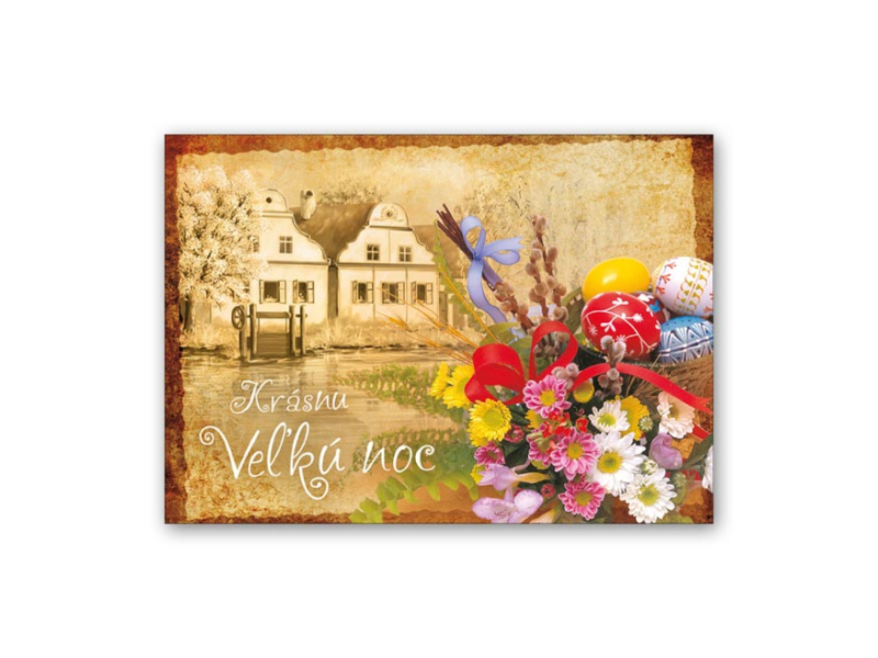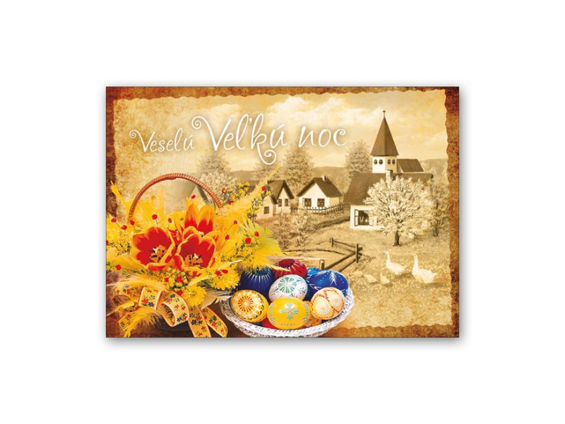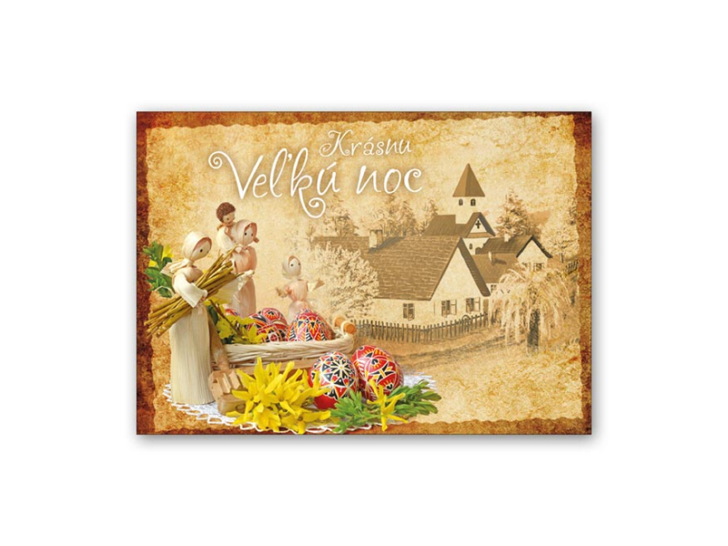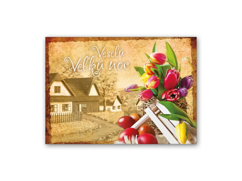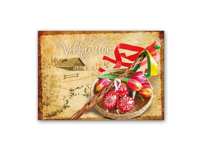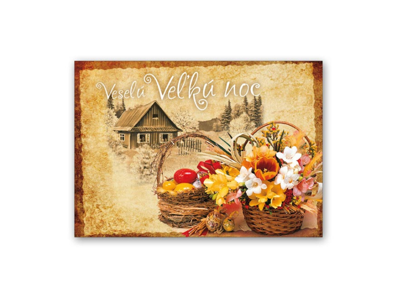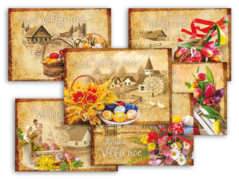 Pohľadnica s veľkonočným motívom. Text obsahuje 6 pohľadníc zo 6. Text na prednej strane: Veselú Vel'kú noc, Krásnu Vel'kú noc Povrchová úprava: bez laku Papier: pohľadnicový kartón 240 g Text: 6/6 Dodávame v mixe podľa skladových zásob. Uvedená cena je za 1 ks.