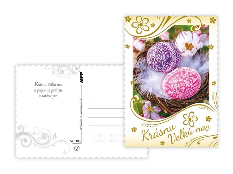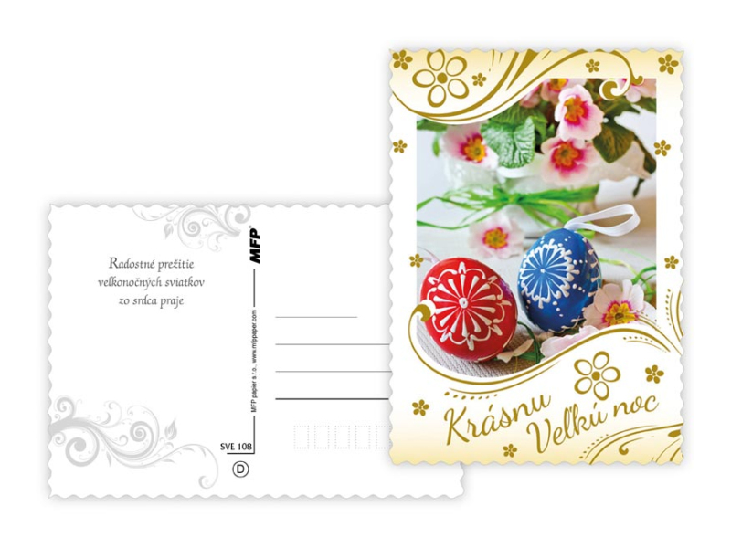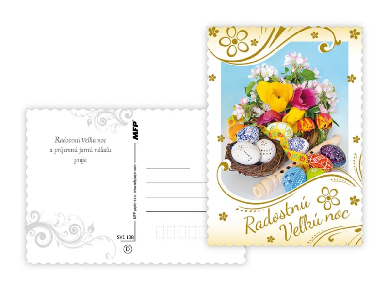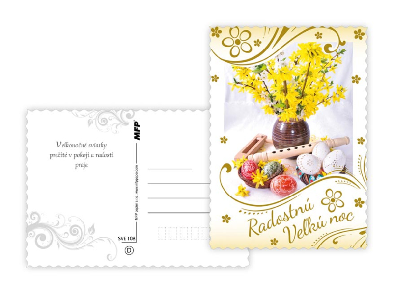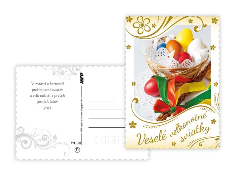 Pohľadnica s veľkonočným motívom. Text obsahuje 6 pohľadníc zo 6. Text na prednej strane: Veselé vel'konočné sviatky, Krásnu Vel'kú noc, Radostnú Vel'kú noc Text na zadnej strane: Pohľadnica 1: V radosti a harmónii prežité jarné sviatky a vel'a radosti z prvých jarných lúčov praje Pohľadnica 2: Krásnu Vel'kú noc a prijemné prežitie sviatkov jari Pohľadnica 3: Vel'konočné sviatky prežité v pokoji a radosti praje Pohľadnica 4: Radostnú Vel'kú noc a prijemnú náladu praje Pohľadnica 5: Radostné prežitie velˇkonočných sviatkov zo srdca praje Pohľadnica 6: Krtásne prežitie velˇkonočných sviatkov a bohatú výslužku zo srdca praje Papier: pohľadnicový kartón 240 g Povrchová úprava: UV lak s výsekom Text: 6/6 Dodávame v mixe podľa skladových zásob. Uvedená cena je za 1 ks.