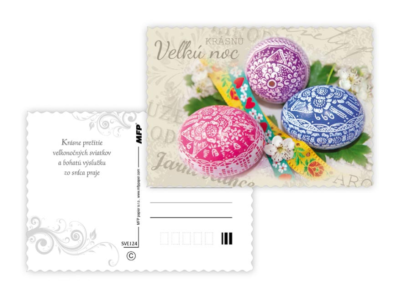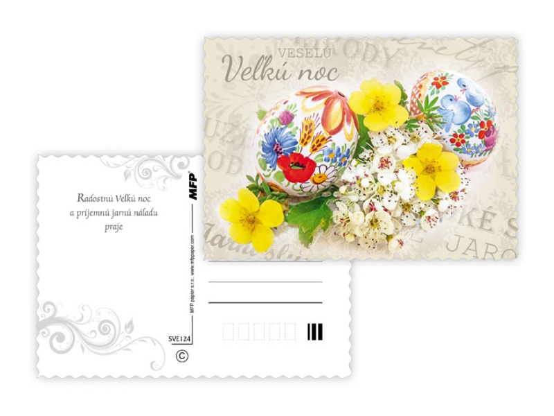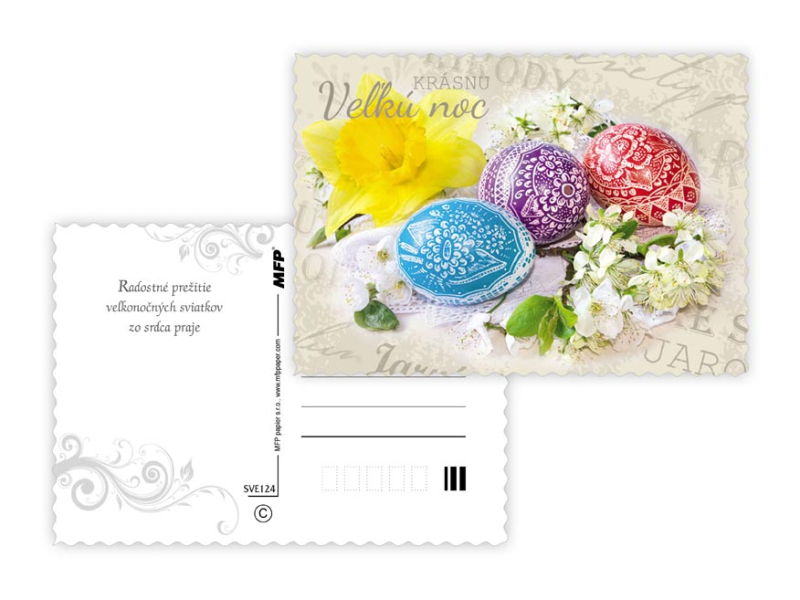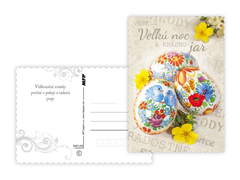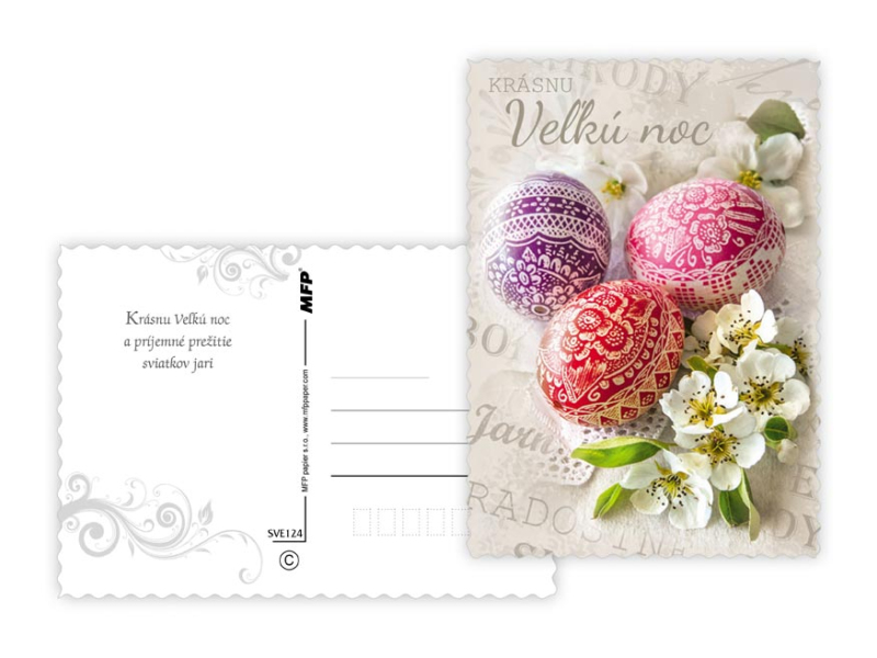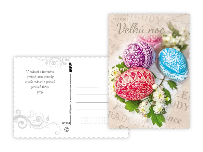 Pohľadnica s veľkonočným motívom. Text na zadnej strane obsahuje 6 pohľadníc zo 6. Text na prednej strane: Krásnu Vel'kú noc, Veselú Vel'kú noc, Veselú Vel'kú noc a krásnu jar Text na zadnej strane: Pohľadnica 1: V radosti a harmónii prežité jarné sviatky a vel'a radosti z prvých jarných lúčov praje Pohľadnica 2: Krásnu Vel'kú noc a prijemné prežitie sviatkov jari Pohľadnica 3: Vel'konočné sviatky prežité v pokoji a radosti praje Pohľadnica 4: Radostnú Vel'kú noc a prijemnú náladu praje Pohľadnica 5: Radostné prežitie velˇkonočných sviatkov zo srdca praje Pohľadnica 6: Krásne prežitie velˇkonočných sviatkov a bohatú výslužku zo srdca praje Papier: pohľadnicový kartón 240 g Povrchová úprava: s výsekom Text: 6/6 Dodáváme v mixu po 6 ks dle skladové zásoby. Uvedená cena je za 1 ks.