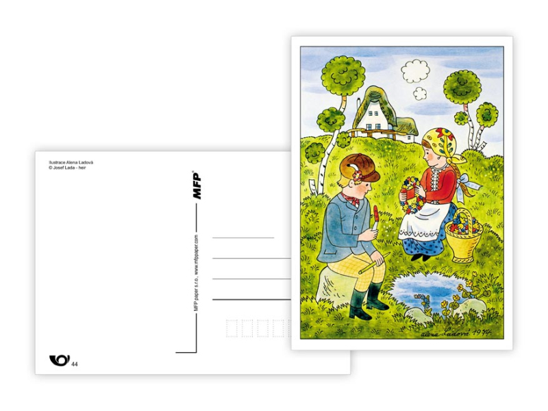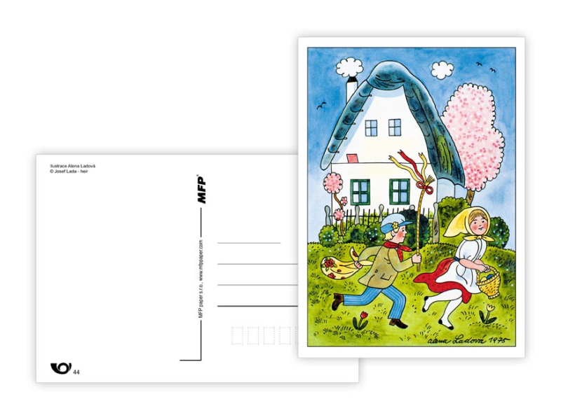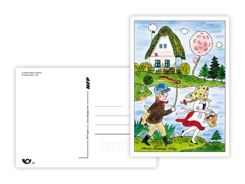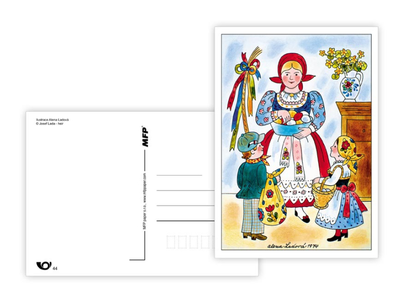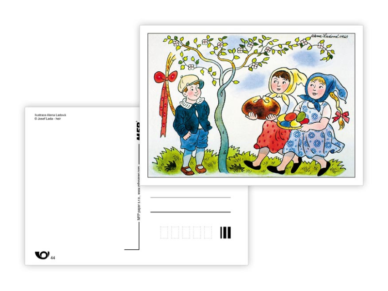 Veľkonočná pohľadnica s ilustráciami Aleny Ladovej. Pohľadnice sú bez textu na zadnej strane. Dodávame v mixe podľa skladových zásob. Papier: pohľadnicový kartón 300 g Povrchová úprava: bez povrchovej úpravy Text: 0/6 Dodávame v mixe po 6 ks podľa skladovej zásoby. Uvedená cena je za 1 ks.