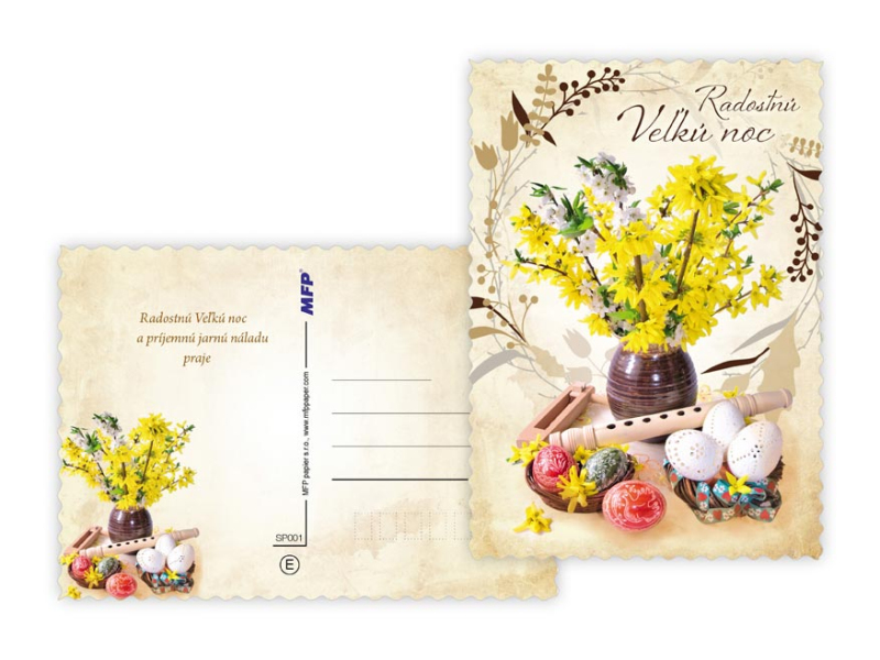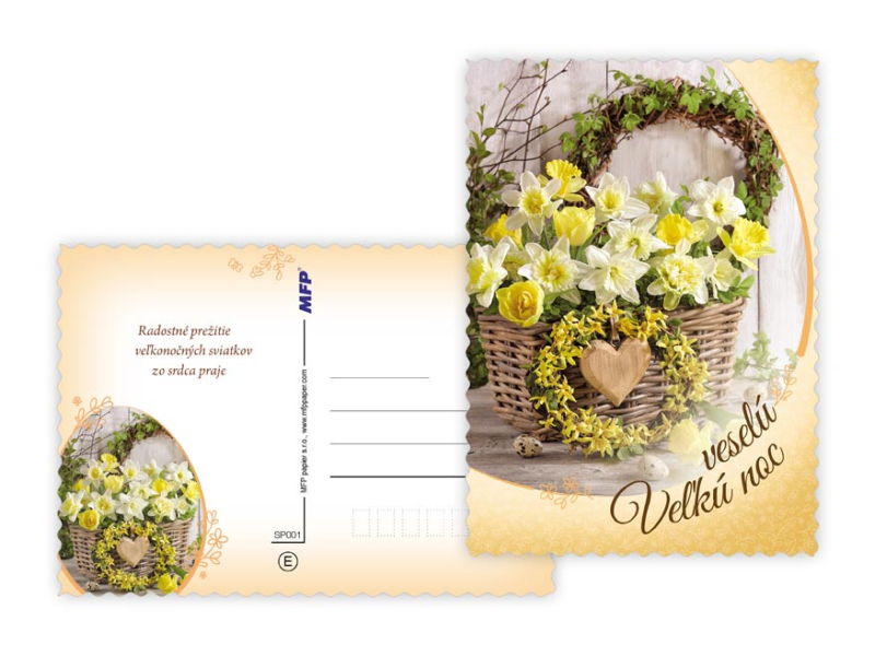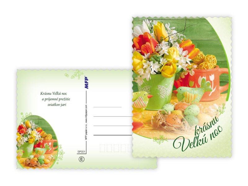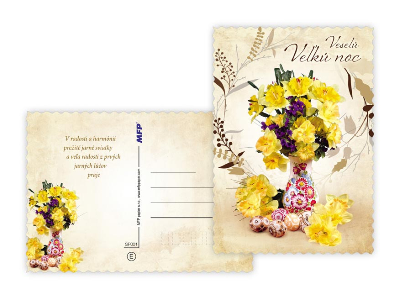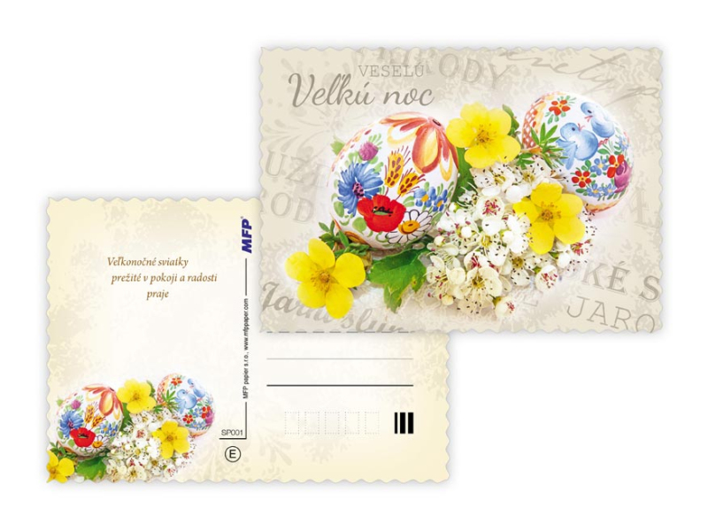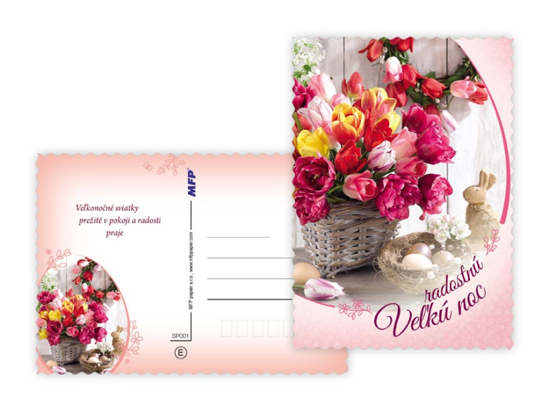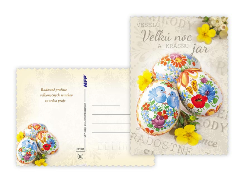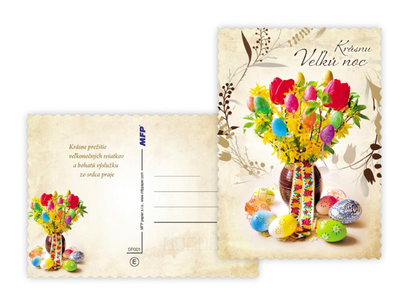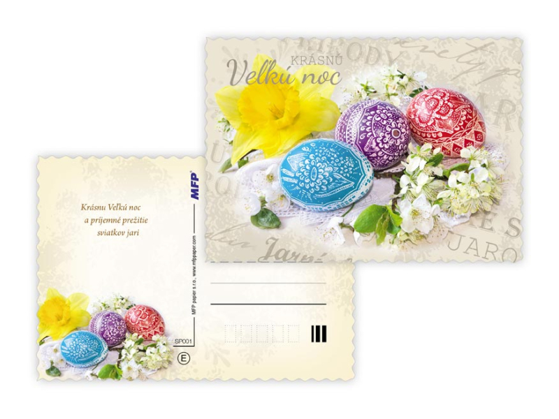 Pohľadnica s veľkonočným motívom. Text obsahuje 9 pohľadníc zo 9. Text na prednej strane: Veselú Vel'kú noc, Radostnú Vel'kú noc, Krásnu Vel'kú noc, Veselú Vel'kú noc a krásnu jar Text vo vnútri: Pohľadnica 1: Radostné prežitie vel'konočných sviatkov zo srdca praje Pohľadnica 2: Vel'konočnej sviatky prežité v pokoji a radosti praje Pohľadnica 3: Krásnu Vel'kú noc a príjemné prežitie sviatkov jari Pohľadnica 4: Radostnú Vel'ků noc a príjemnú jarnú náladu praje Pohľadnica 5: Krásne prežitie vel'konočných sviatkov a bohatú výslužku zo srdca praje Pohľadnica 6: V radosti a harmónii prežité jarné sviatky a vel'a radosti z prvých jarných lúčov praje Pohľadnica 7: Radostné prežitie vel'konočných sviatkov zo srdca praje Pohľadnica 8: Vel'konočné sviatky prežité v pokoji a radosti praje Pohľadnica 9: Krásnu Vel'kú noc a príjemné ptežitie sviatkov jari Papier: pohľadnicový kartón 240 g Povrchová úprava: UV lak, výsek Text: 9/9 Dodávame v mixe podľa skladových zásob. Uvedená cena je za 1 ks.