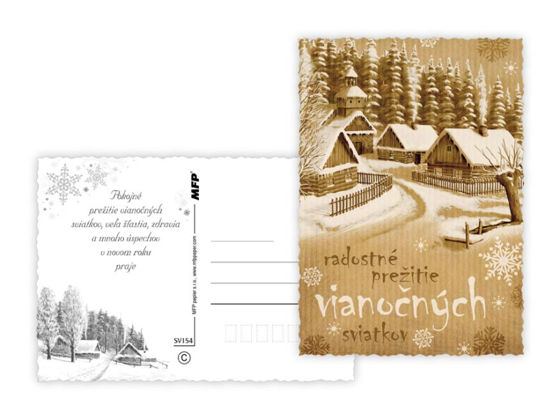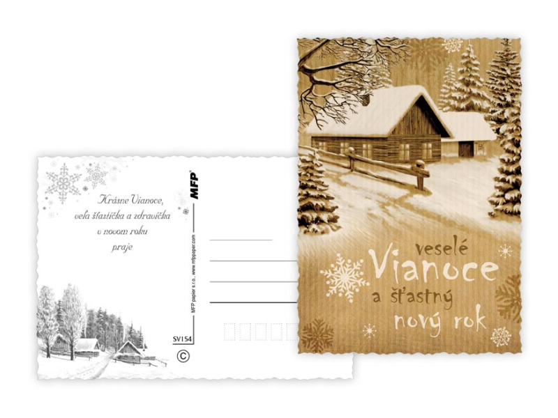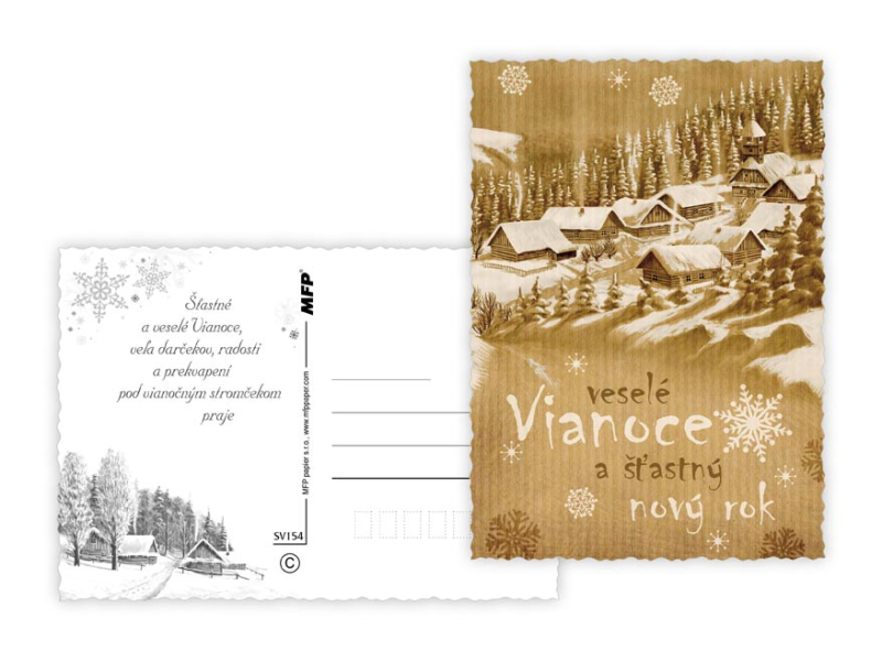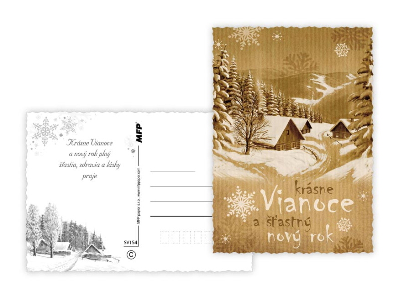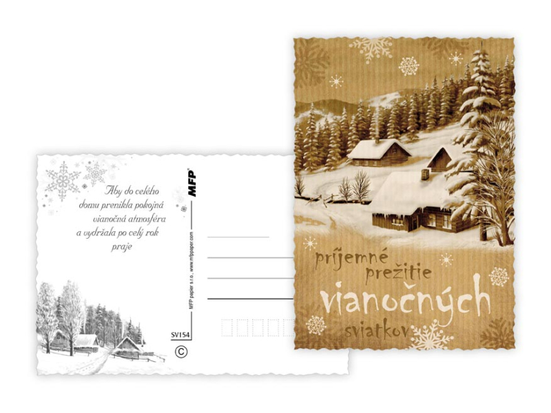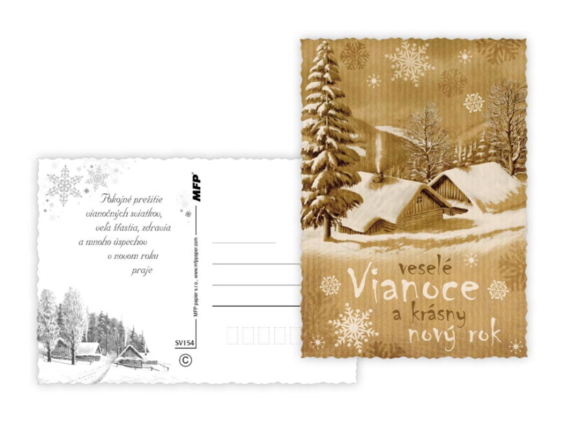 Pohľadnice s vianočným motívom. Text obsahuje 6 pohľadníc zo 6. Text na prednej strane: Veselé Vianoce a šťastný nový rok, Radostné prežitie vianočných sviatkov, Veselé Vianoce a krásny nový rok, Príjemné prežitie vianočných sviatkov, Krásne Vianoce a šťastný nový rok Text vo vnútri: Pohľadnica 1: Šťastné a veselé Vianoce, veľa darčekov, radosti a prekvapení pod vianočným stromčekom praje Pohľadnica 2: Pokojné prežitie vianočných sviatkov, veľa šťastia, zdravia a mnoho úspechov v novom roku praje Pohľadnica 3: Krásne Vianoce, veľa šťastíčka a zdravíčka v novom roku praje Pohľadnica 4: Krásne Vianoce a nový rok plný šťastia, zdravia a lásky praje Pohľadnica 5: Aby do celého domu prenikla pokojná vianočná atmosféra a vydržala po celý rok praje Pohľadnica 6: Pokojné prežitie vianočných sviatkov, veľa šťastia, zdravia a mnoho úspechov v novom roku praje Papier: pohľadnicový kartón 240 g Povrchová úprava: výsek Text: 6/6 Dodávame v mixe podľa skladových zásob. Uvedená cena je za 1 ks.