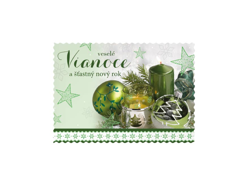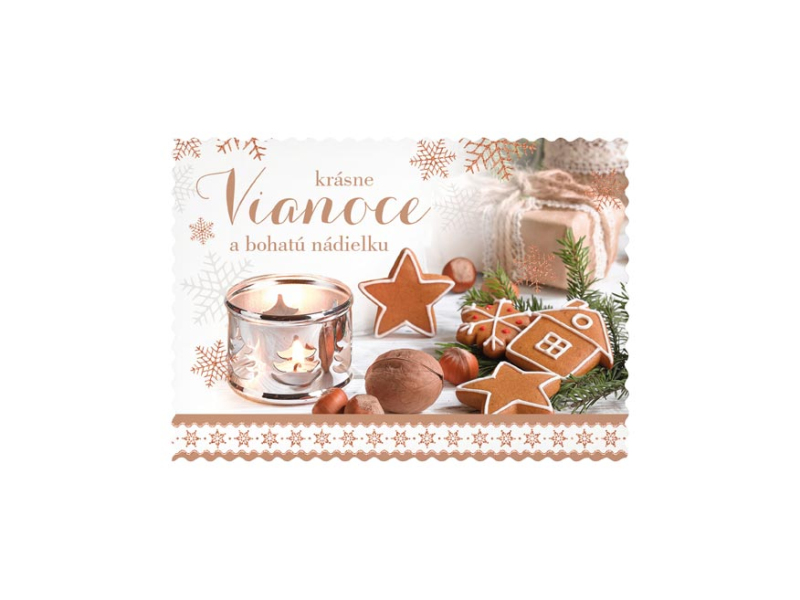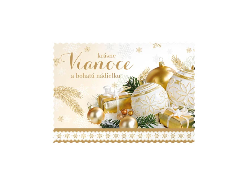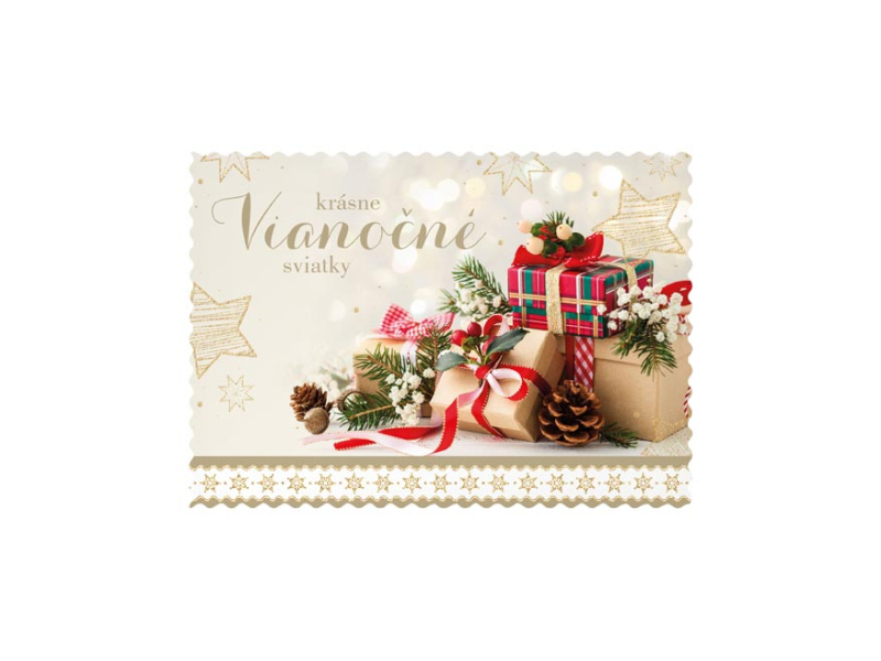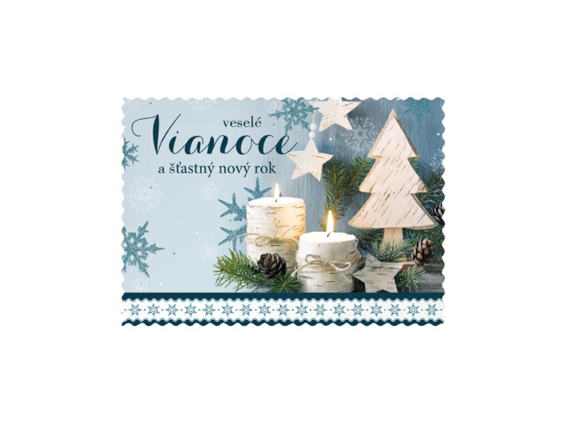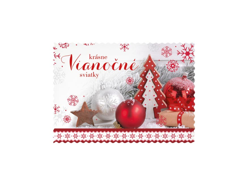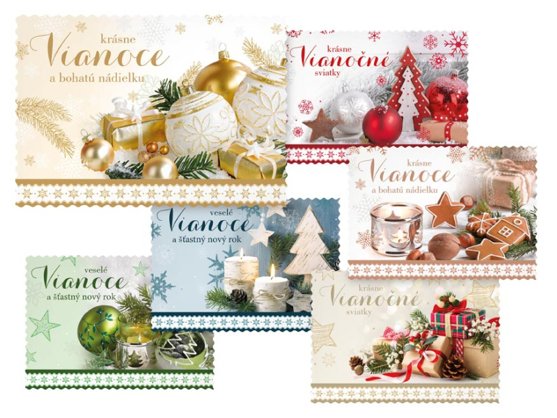 Pohľadnica s vianočným motívom. Text obsahuje 6 pohľadníc zo 6. Text na prednej strane: Krásne Vianoce a bohatú nadielku, Krásne Vianočné sviatky, Veselé Vianoce a šťastný nový rok, Text vo vnútri: Pohľadnica 1: Pokojné prežitie vianočných sviatkov a v novom roku všetko dobré praje Pohľadnica 2: Pokojné prežitie vianočných sviatkov, veľa šťastia, zdravia a mnoho úspechov v novom roku praje Pohľadnica 3: Šťastné a veselé Vianoce, veľa darčekov, radosti a prekvapení pod vianočným stromčekom praje Pohľadnica 4: Krásne Vianoce, veľa šťastíčka a zdravíčka v novom roku praje Pohľadnica 5: Krásne Vianoce a nový rok plný šťastia, zdravia a lásky praje Pohľadnica 6: Aby do celého domu prenikla pokojná vianočná atmosféra a vydržala po celý rok praje Papier: pohľadnicový kartón 240 g Povrchová úprava: UV lak, výsek, glitr Text: 6/6 Dodávame v mixe podľa skladových zásob. Uvedená cena je za 1 ks.
