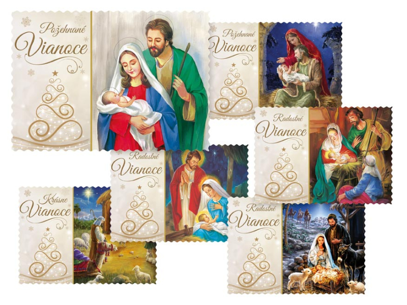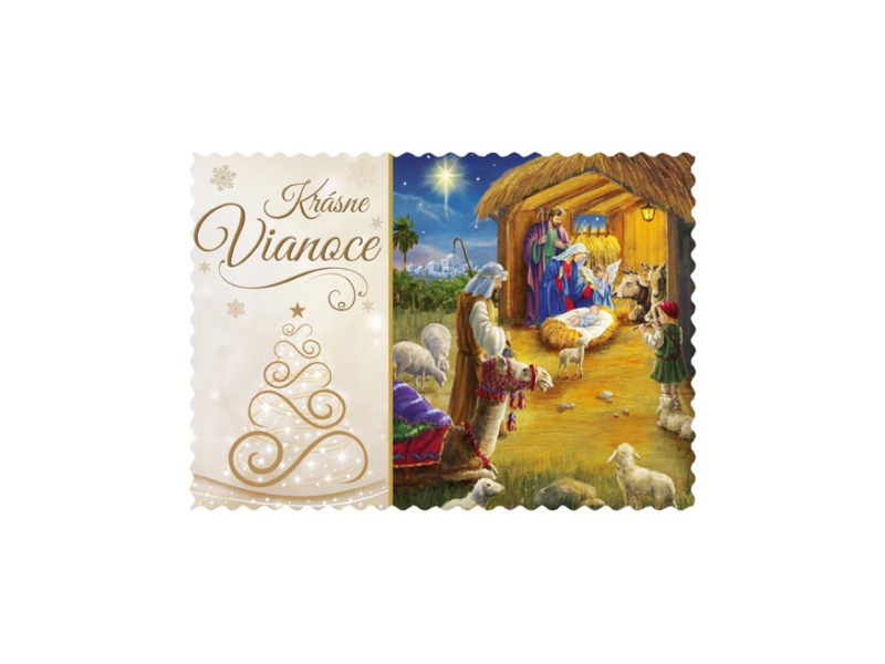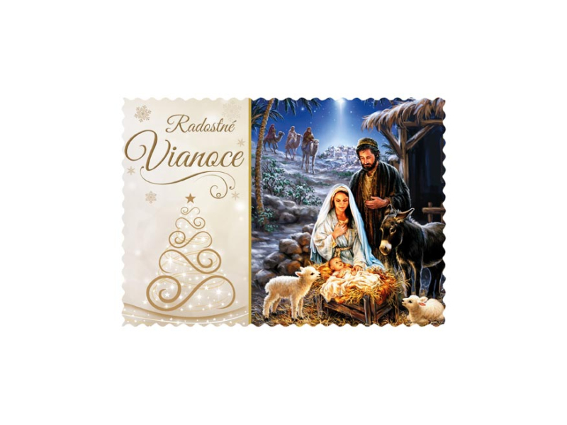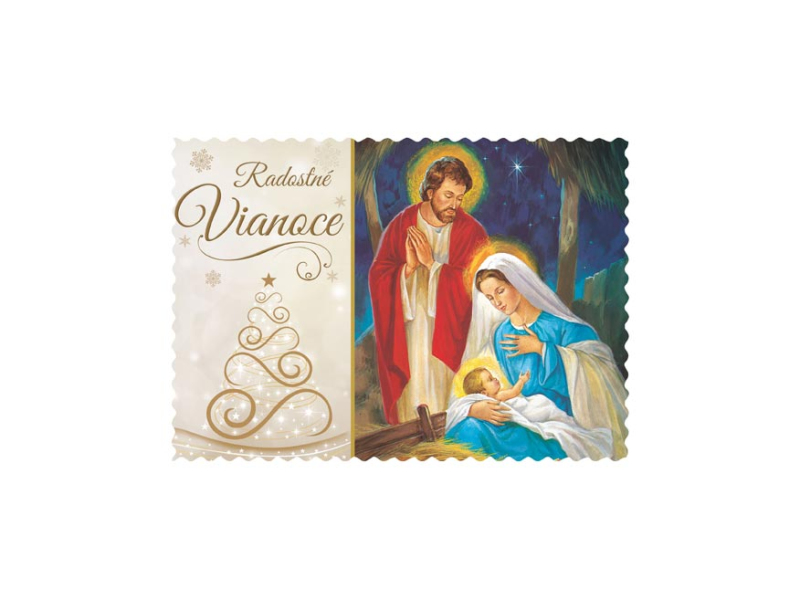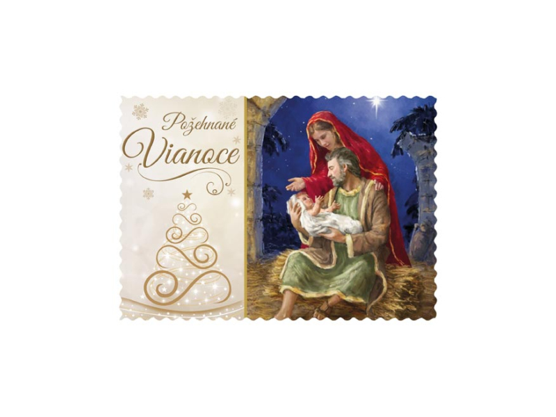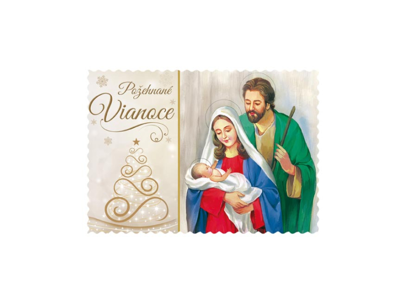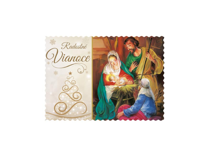 Pohľadnica s vianočným motívom. Text obsahuje 6 pohľadníc zo 6. Text na prednej strane: Požehnané Vianoce, Radostné Vianoce, Krásne Vianoce Text vo vnútri: Pohľadnica 1: Pokojné vianočné sviatky naplnené radosťou a požehnaný nový rok praje Pohľadnica 2: Vianočné sviatky prežité v pokoji a radosti z Ježičkovho narodenia praje Pohľadnica 3: Pokojné vianočné sviatky naplnené radosťou a požehnaný nový rok praje Pohľadnica 4: Aby do celého domu prenikla pokojná vianočná atmosféra a vydržala po celý rok praje Pohľadnica 5: Vianočné sviatky prežité v pokoji a radosti z Ježičkovho narodenia praje Pohľadnica 6: Pokojné vianočné sviatky naplnené radosťou a požehnaný nový rok praje Papier: pohľadnicový kartón 240 g Povrchová úprava: UV lak, výsek, glitr Text: 6/6 Uvedená cena je za 1 ks. Dodávame v mixe podľa skladových zásob.