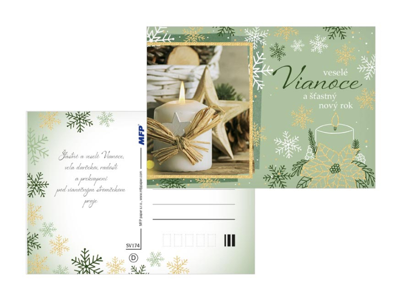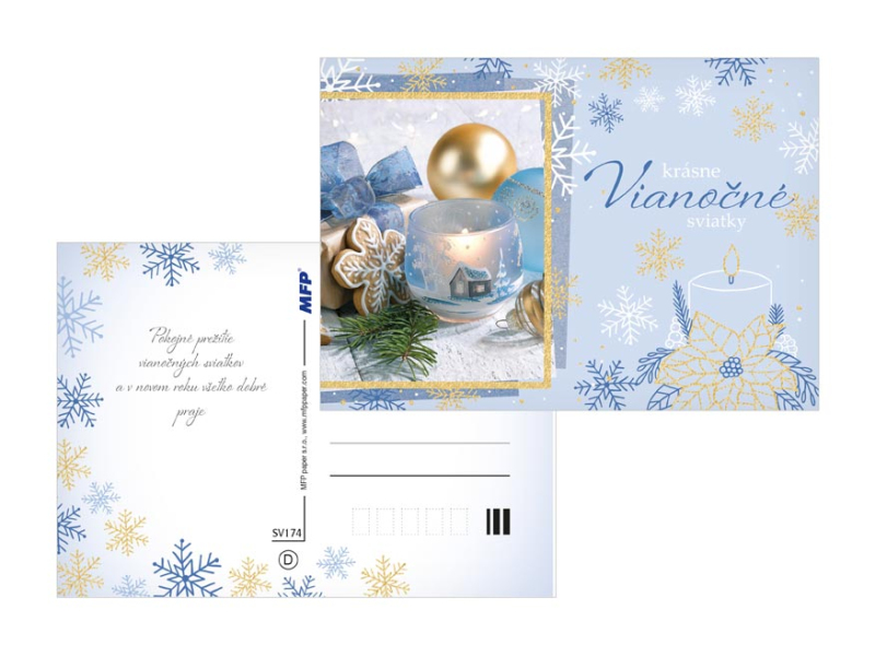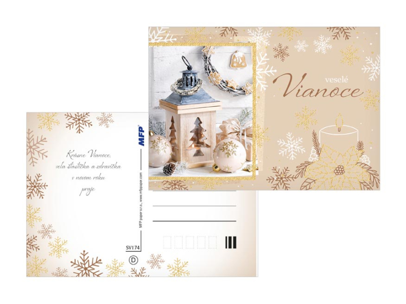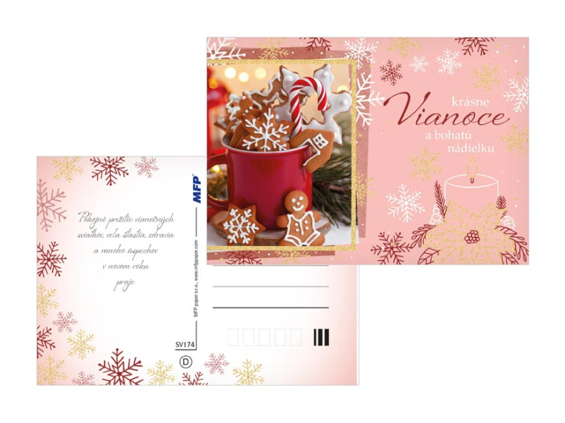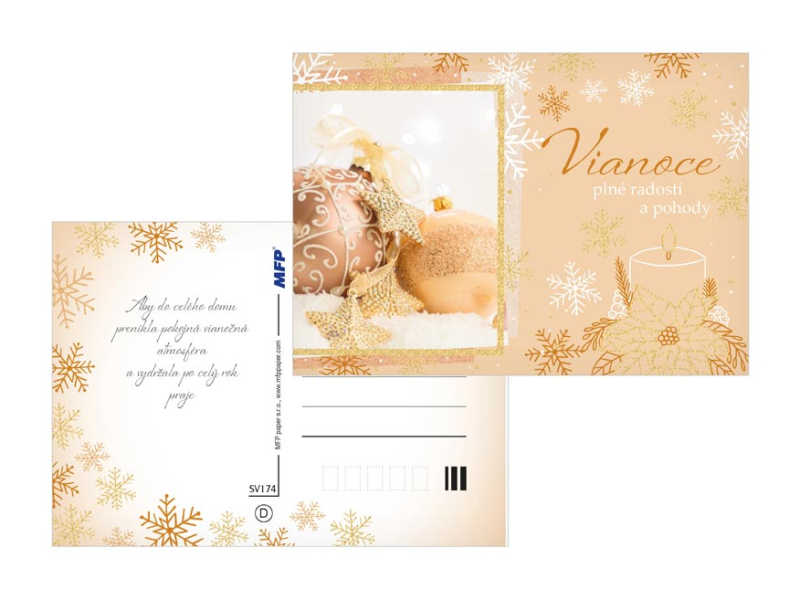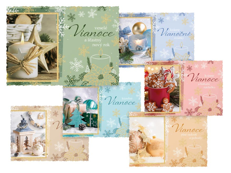 Pohľadnica s vianočným motívom. Text na zadnej strane obsahujú 6 pohľadnice zo 6. Text na prednej strane: Veselé Vianoce a šťastný nový rok, Krásne Vianoce a bohatú nádielku, Krásne Vianočné sviatky, Vianoce plné radosti a pohody kúzelné Vianoce, Veselé Vianoce Text na zadnej strane: Pohľadnica 1: Šťastné a veselé Vianoce, veľa darčekov, radosti a prekvapenia pod vianočným stromčekom praje Pohľadnica 2: Pokojné prežitie vianočných sviatkov, veľa šťastia, zdravia a mnoho úspechov v novom roku praje Pohľadnica 3: Pokojné prežitie vianočných sviatkov a v novom roku všetko dobré praje Pohľadnica 4: Aby do celého domu prenikla pokojná vianočná atmosféra a vydržala po celý rok praje Pohľadnice 5: Krásne Vianoce a nový rok plný šťastia, zdravia a lásky praje Pohľadnice 6: Krásne Vianoce, veľa šťastíčka a zdravíčka v novom roku praje Papier: pohľadnicový kartón 240 g Povrchová úprava: UV lak, výsek, gliter Text: 6/6 Dodávame v mixe po 6 ks podľa skladovej zásoby. Uvedená cena je za 1 ks.