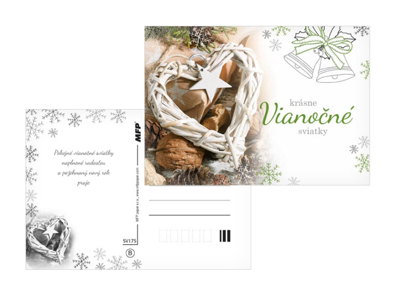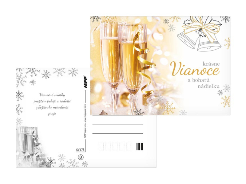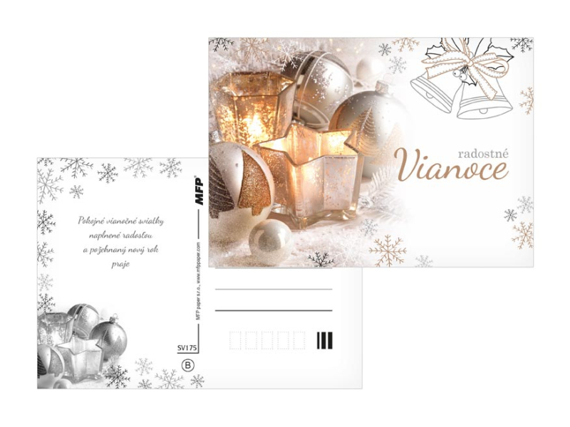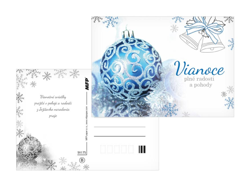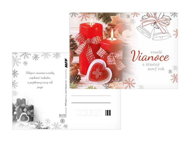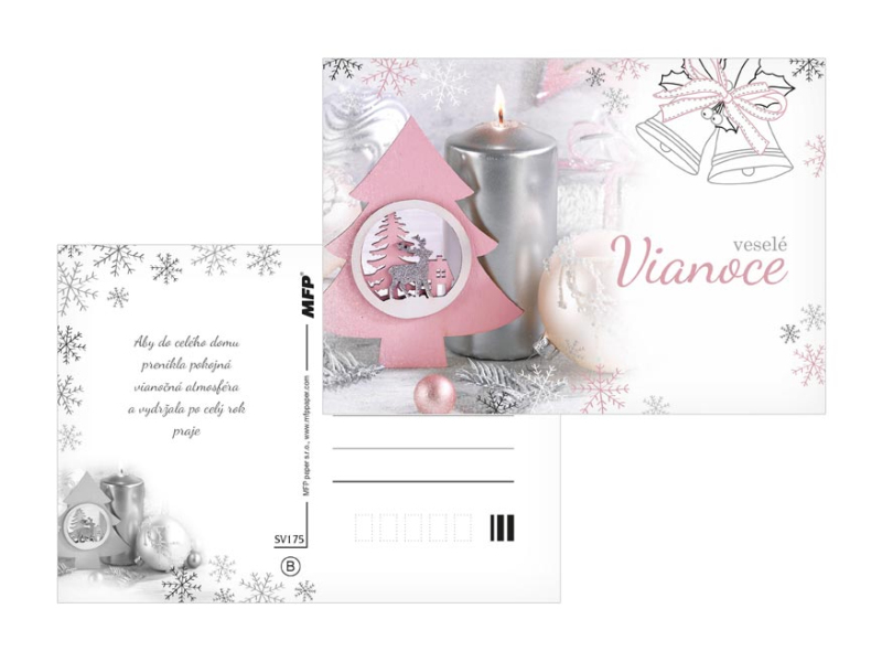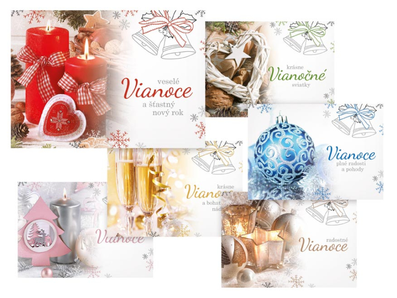 Pohľadnica s vianočným motívom. Text na zadnej strane obsahujú 6 pohľadnice zo 6. Text na prednej strane: Veselé Vianoce a šťastný nový rok,Vianoce plné radosti a pohody, Krásne Vianočné sviatky, Radostné Vianoce, Krásne Vianoce a bohatú nádielku, Veselé Vianoce Text na zadnej strane: Pohľadnica 1: Pokojné vianočné sviatky naplnené radosťou a požehnaný nový rok praje Pohľadnica 2: Vianočné sviatky prežité v pokoji a radosti z Ježíšovho narodenia praje Pohľadnica 3: Pokojné vianočné sviatky naplnené radosťou a požehnaný nový rok praje Pohľadnica 4: Pokojné vianočné sviatky naplnené radosťou a požehnaný nový rok praje Pohľadnice 5: Vianočné sviatky prežité v pokoji a radosti z Ježíšovho narodenia praje Pohľadnice 6: Aby do celého domu prenikla pokojná vianočná atmosféra a vydržala po celý rok praje Papier: pohľadnicový kartón 240 g Povrchová úprava: bez úpravy Text: 6/6 Dodávame v mixe po 6 ks podľa skladovej zásoby. Uvedená cena je za 1 ks.