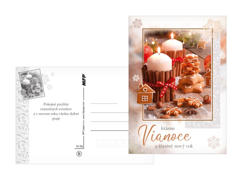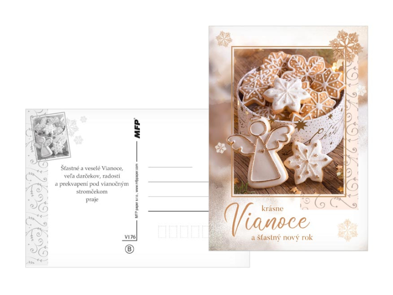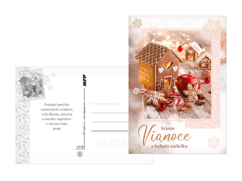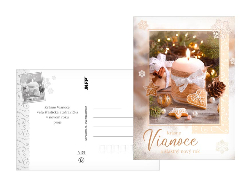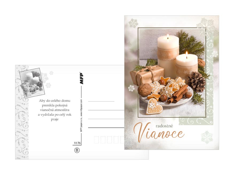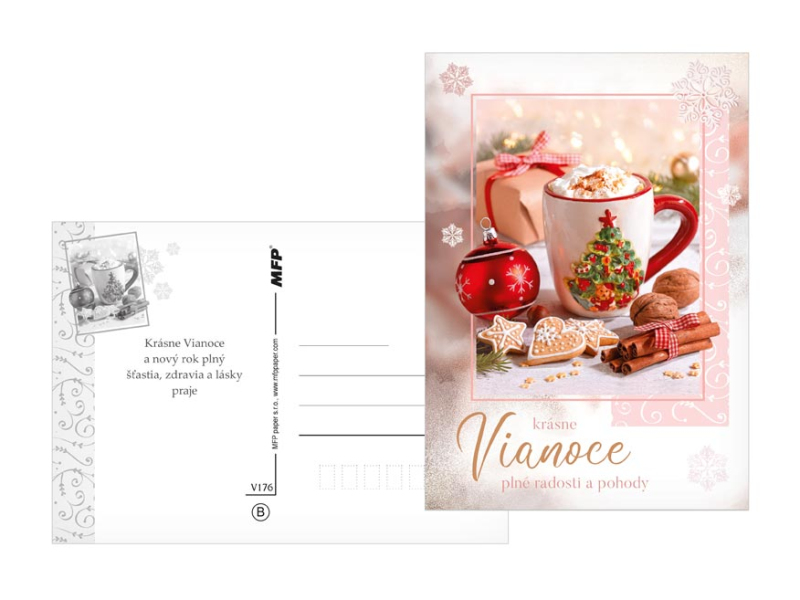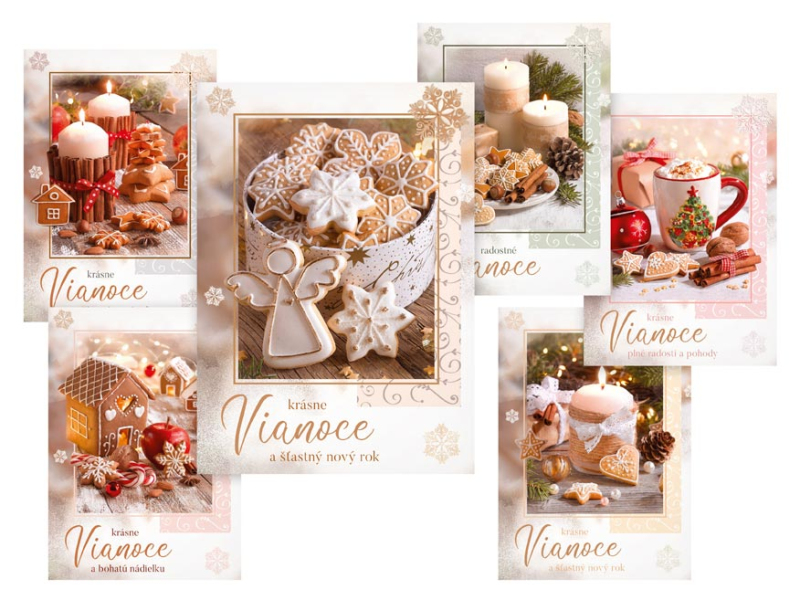 Pohľadnica v mixe vianočných motívov. Text obsahuje 6 pohľadníc zo 6. Text na prednej strane: krásne Vianoce, krásne Vianoce a bohatú nádielku, krásne Vianoce a šťastný nový rok, radostné Vianoce, krásne Vianoce plné radosti a pohody, krásne Vianoce a šťastný nový rok Text na zadnej strane: Pohľadnica 1:Šťastné a veselé Vianoce, veľa darčekov, radosti a prekvapení pod vianočným stromčekom praje Pohľadnica 2: Pokojné prežitie vianočných sviatkov, veľa šťastia, zdravia a mnoho úspechov v novom roku praje Pohľadnica 3: Pokojné prežitie vianočných sviatkov a v novom roku všetko dobré praje Pohľadnica 4: Aby do celého domu prenikla pokojná vianočná atmosféra a vydržala po celý rok praje Pohľadnice 5: Krásne Vianoce a nový rok plný šťastia, zdravia a lásky praje Pohľadnice 6: Krásne Vianoce, veľa šťastíčka a zdravíčka v novom roku praje Text: 6/6 Povrchová úprava: UV lak Papier: pohľadnicový kartón 240 g Dodávame v mixe po 6 ks podľa skladovej zásoby. Uvedená cena je za 1 ks.