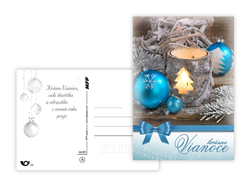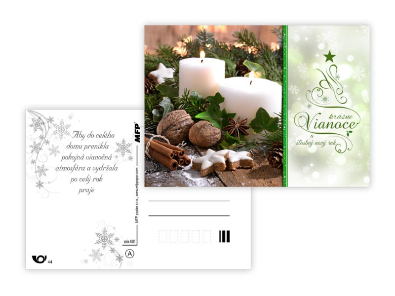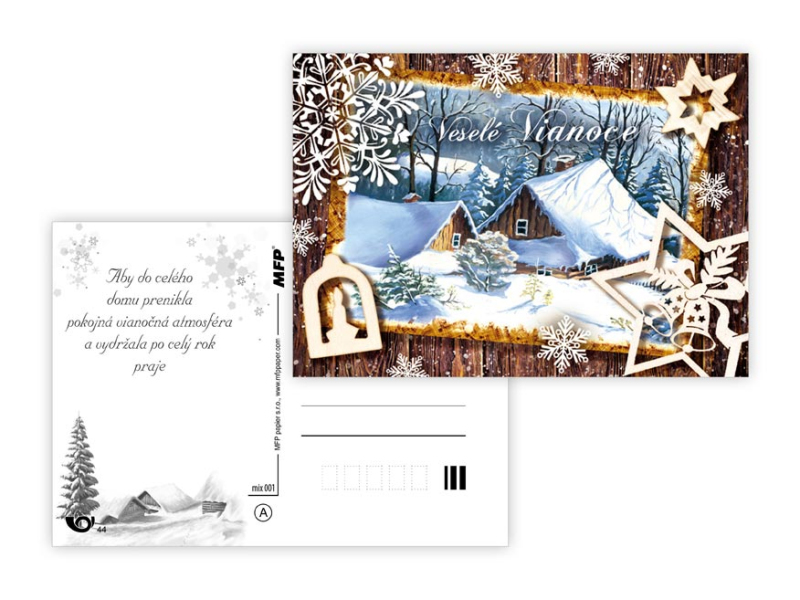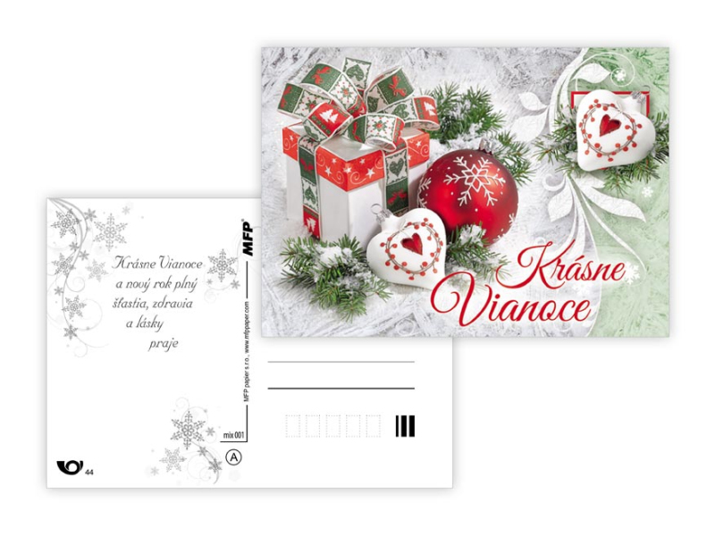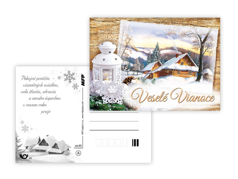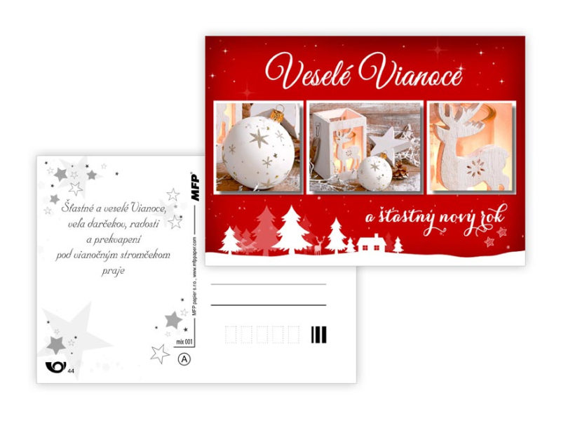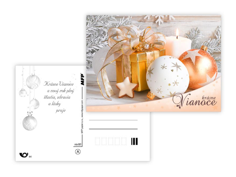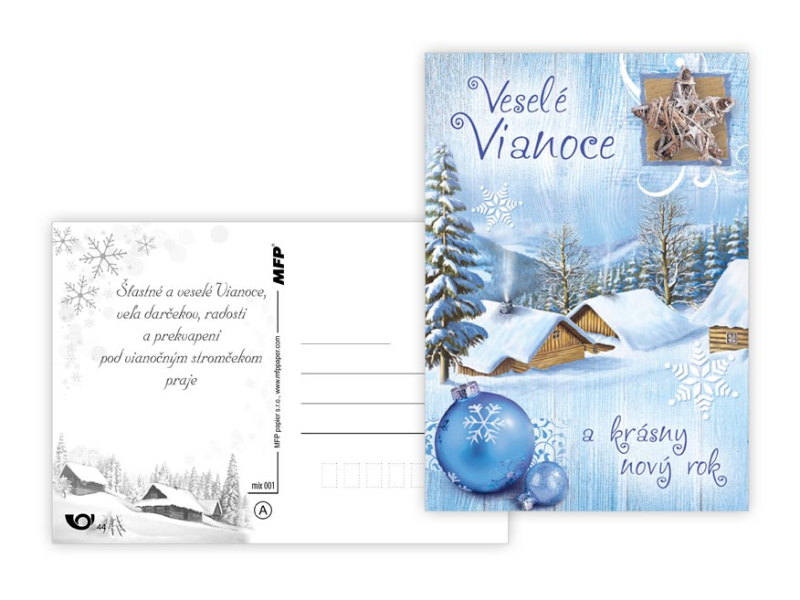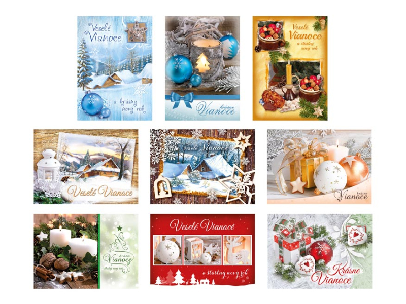 Pohľadnice s vianočným motívom. Text obsahuje 9 pohľadníc zo 9. Text na prednej strane: Veselé Vianoce a krásny nový rok, Veselé Vianoce a šťastný nový rok, Veselé Vianoce, Krásne Vianoce, Krásne Vianoce a šťastný nový rok, Veselé Vianoce a šťatsný nový rok, Text vo vnútri: Pohľadnica 1: Krásne Vianoce, veľa šťastíčka a zdravíčka v novom roku praje Pohľadnica 2: Krásne Vianoce a nový rok plný šťastia, zdravia a lásky praje Pohľadnica 3: Pokojné prežitie vianočných sviatkov, veľa šťastia, zdravia a mnoho úspechov v novom roku praje Pohľadnica 4: Šťastné a veselé Vianoce a veľa darčekov, radosti a prekvapení pod vianočným stromčekom praje Pohľadnica 5: Pokojné prežitie vianočných sviatkov, veľa šťastia, zdravia a mnoho úspechov v novom roku praje Pohľadnica 6: Krásne Vianoce a veľa šťastíčka a zdravíčka v novom roku praje Pohľadnica 7: Pokojné prežitie vianočných sviatkov, veľa šťastia, zdravia a mnoho úspechov v novom roku praje Pohľadnica 8: Krásne Vianoce a nový rok plný šťastia, zdravia a lásky praje Pohľadnica 9: Krásne Vianoce, veľa šťastíčka a zdravíčka v novom roku praje Papier: pohľadnicový kartón 240 g Povrchová úprava: Text: 9/9 Dodávame v mixe podľa skladových zásob. Uvedená cena je za 1 ks.