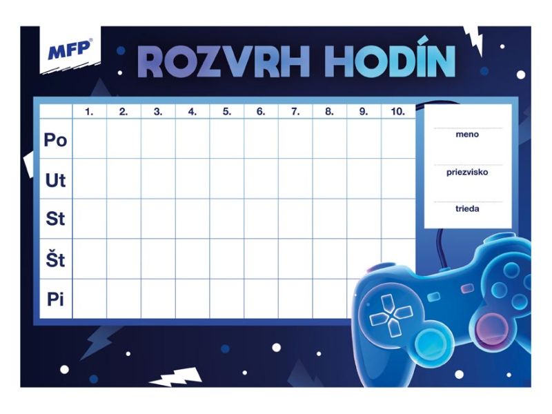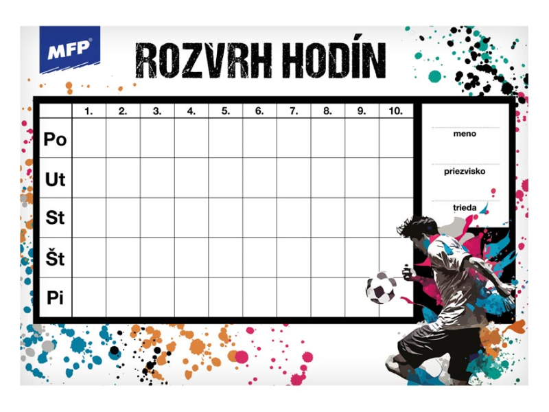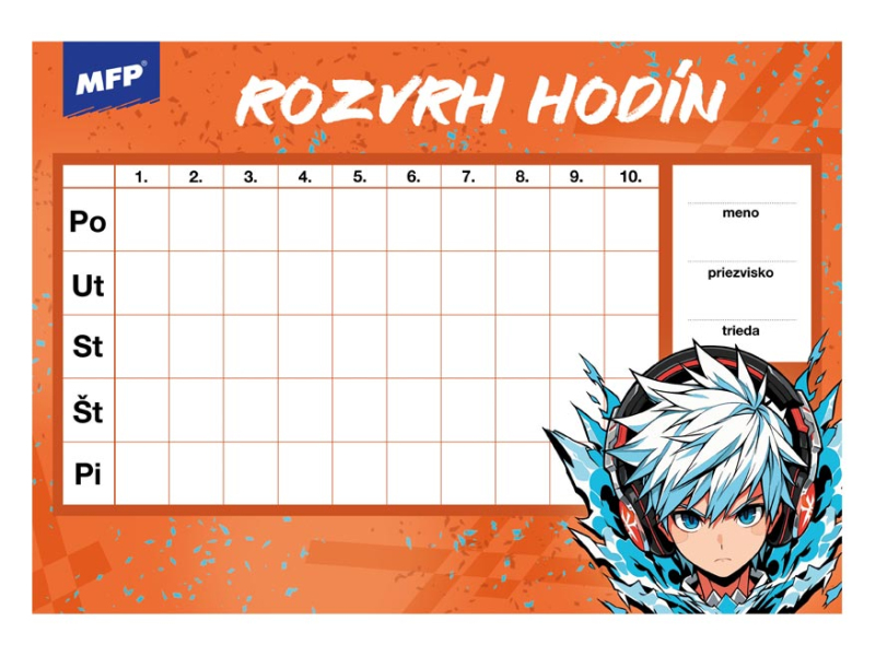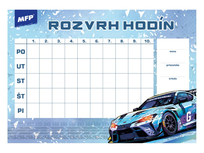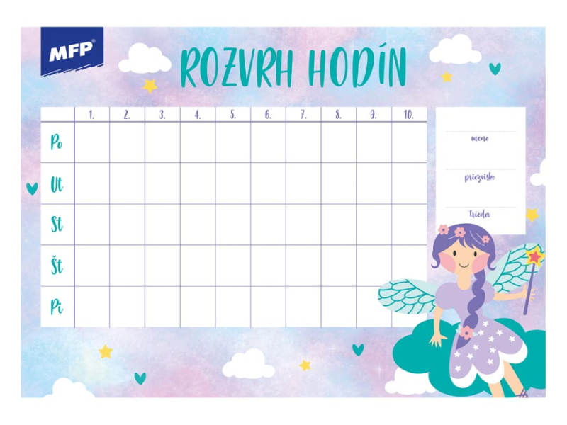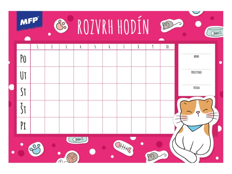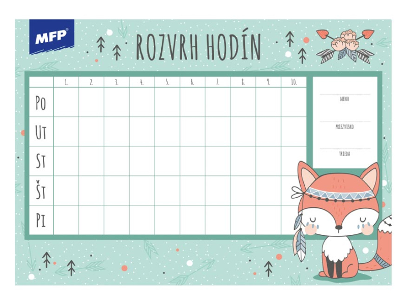 Detský rozvrh hodín, s ťahákom – vybranými slovami, matematickými vzorcami a malou násobilkou. Rozvrh hodín obsahuje: - 10 vyučovacích hodín - malú násobilku - vymenované slová - geometrické vzorce - pravítko Formát: A5 Motív: plameniak, šteňa, leňochod, auto, kôň, mačiatko, smajlíci, grafity Dodávame v rôznych motívoch po 8 ks podľa skladovej zásoby. Uvedená cena je za 1 ks.