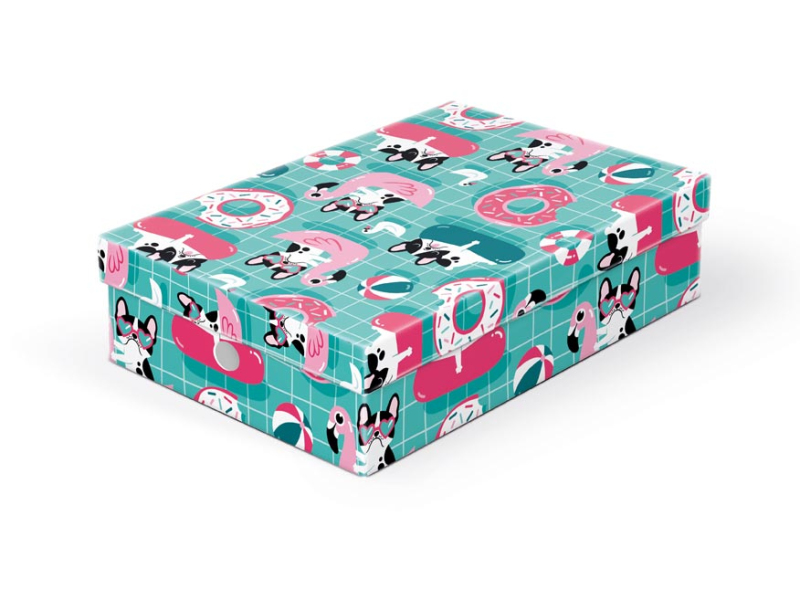 Papierová krabica na ukladanie vecí na výtvarnú výchovu alebo aj iných školských potrieb. Do krabice sa zmestí formát A4. Materiál: kartón Rozmer:330 x 225 x 80 mm Motív: buldoček s plameniakom Uvedená cena je za 1 ks.