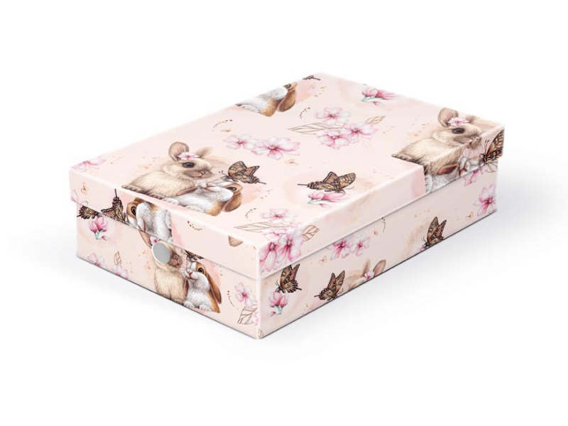 Školská krabica z kartónu, s motívom zajačikov. Vhodná na ukladanie nevyhnutných pomôcok na výtvarnú výchovu alebo iných školských potrieb. Do krabice sa zmestí formát A4. Materiál: kartón Motív: zajačikovia Rozmer: 330 x 225 x 80 mm Uvedená cena je za 1 ks.