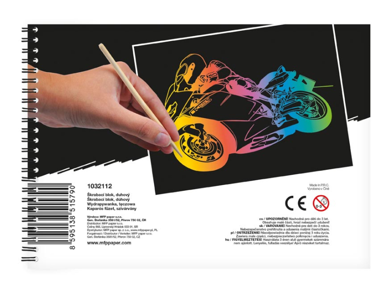 Notes na vyškrabávanie perom. Doprajte si chvíľku oddychu a kreatívne sa pozabávajte v notese na vyškrabávanie. Na jednotlivých listoch môžete pomocou vyškrabávacieho pera vytvárať rôzne pestrofarebné obrázky. Deti si zlepšia motoriku rúk a naučia sa kresliť. NOTES OBSAHUJE: - 10 listov - 1 škrabadlo VAROVANIE: Nevhodné pre deti do 3 rokov. Obsahuje malé časti – hrozí nebezpečenstvo udusenia. Dodávame v plastovom obale. Uvedená cena je za 1 balenie.