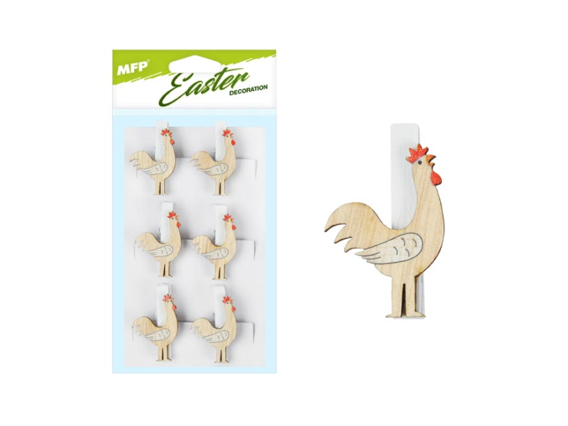 Štipce v dizajne drevených kohútov slúžia ako krásna dekorácia do exteriéru alebo na skrášlenie interiéru. Balenie obsahuje: - 6 ks štipcov (kohúti) Dodávame vo vrecku so závesom. Uvedená cena je za 1 balenie.
