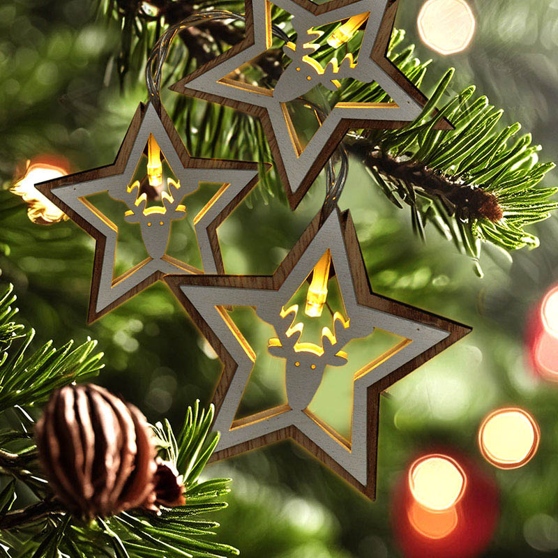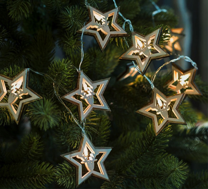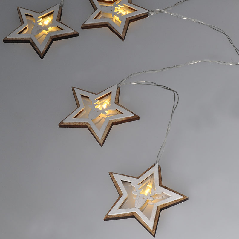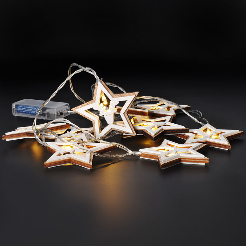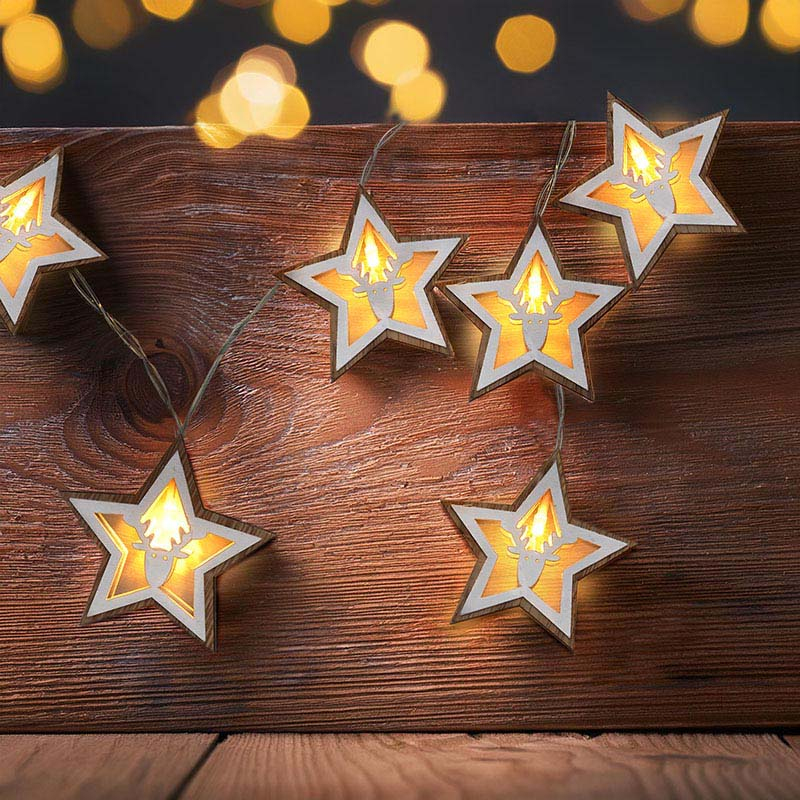 - vianočná dekoratívna reťaz s drevenými hviezdami a LED diódami