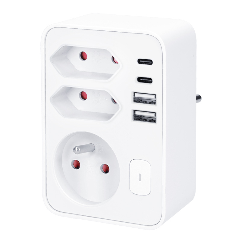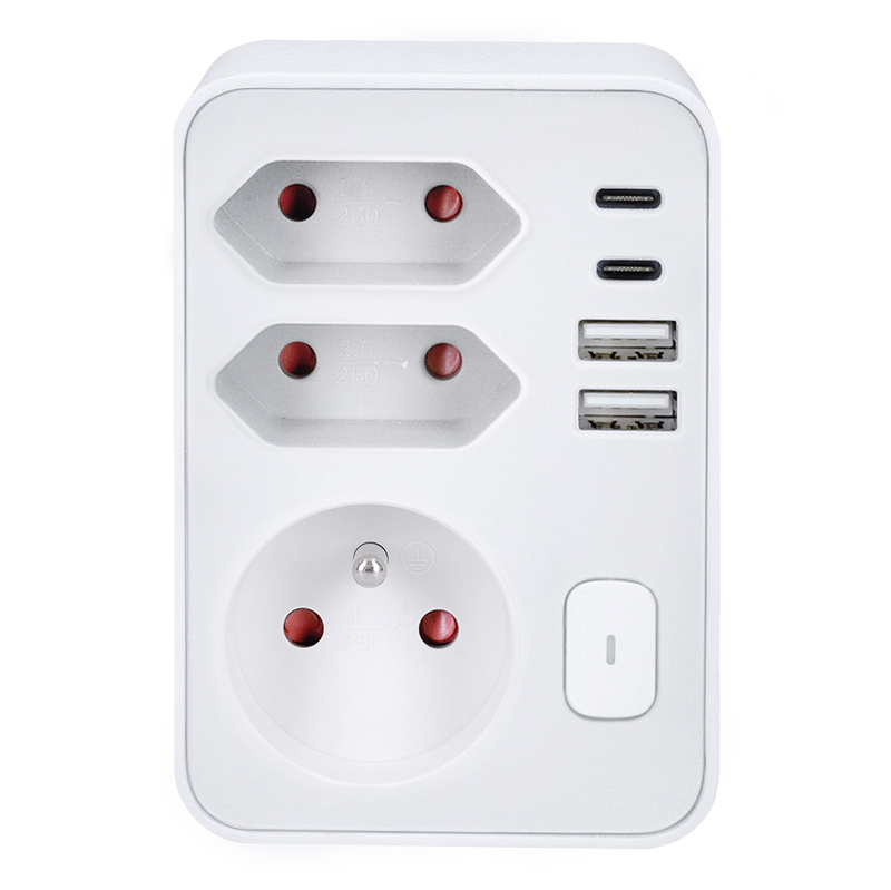 Tri zásuvky (1× 16 A + 2× 2,5 A) zvládnu celkovú záťaž až 3680 W a umožnia pripojiť bežné spotrebiče v obývačke, spálni alebo pracovni. Zásuvky sú navyše vybavené detskými poistkami, čo zaisťuje bezpečnú prevádzku aj v domácnostiach s deťmi. Vďaka dvom USB-A a dvom USB-C portom môžete pohodlne nabíjať až štyri zariadenia súčasne – s celkovým výkonom až 17 W. Perfektný pre všetku USB elektroniku.