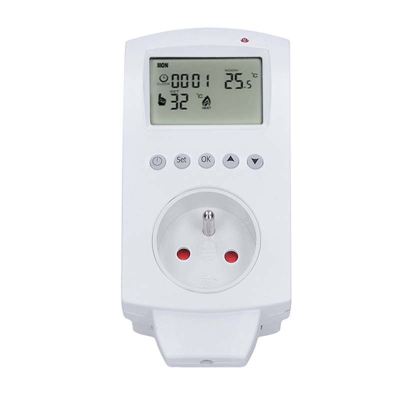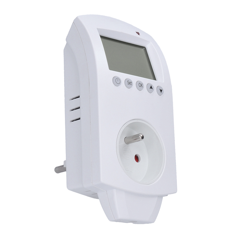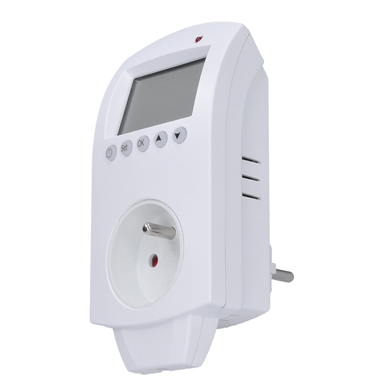 - termostaticky spínaná programovateľná zásuvka pre vnútorné použitie, spína pri dosiahnutí nastavenej teploty