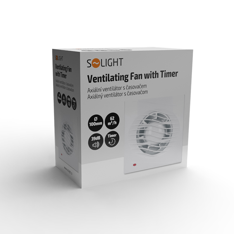 Ventilátor Solight AV05T je navrhnutý na efektívne odvetrávanie priestorov, ako sú sprchy, kuchyne, kúpeľne a WC. Jeho kompaktný dizajn s priemerom pripojenia 100 mm a hlučnosťou 39 dB zabezpečuje tichú prevádzku. Príkon je 13 W a prietok vzduchu dosahuje 62 m3/h. Pre zabezpečenie optimálneho odvetrávania je možné dokúpiť spätnú klapku (AV-K01). Napájanie je 230 V/50 Hz.