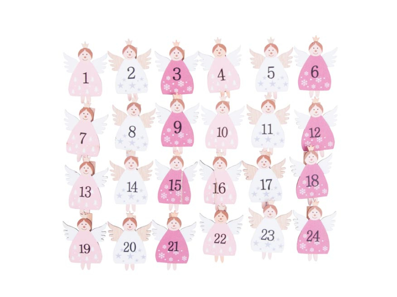 Originálny, adventný kalendár s anjelmi. Vytvorte si netradičný adventný kalendár s drevenými štipcami s anjelom v rôznych farbách. Dodá vám tú správnu vianočnú atmosféru. Vyrobený z preglejky. BALENIE OBSAHUJE: - 24 ks štipcov ( anjel ) Uvedená cena je za 1 balenie.