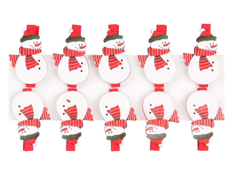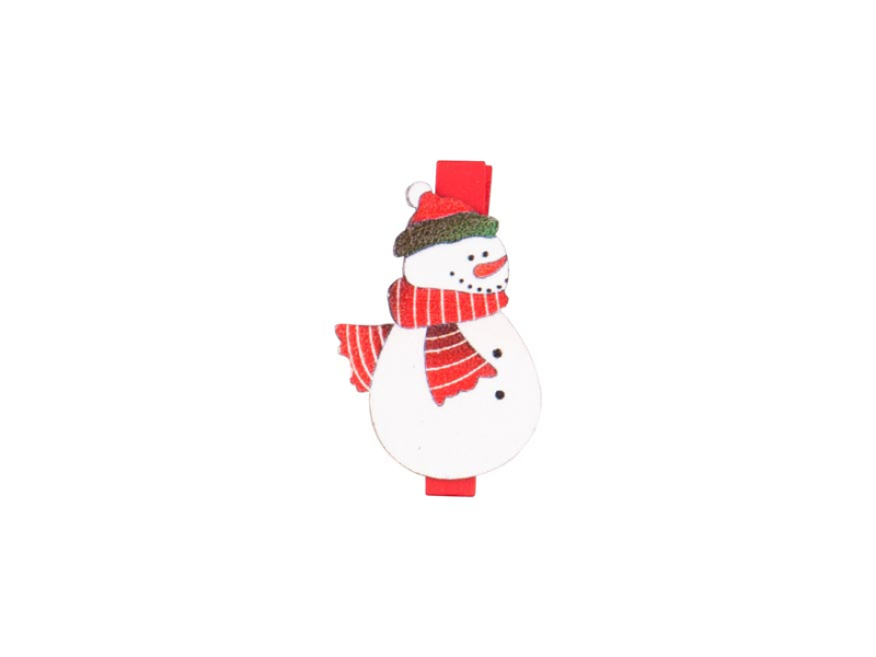 Vianočná, drevená dekorácia snehuliak nalepený na červenom štipcu, ozdobí váš vianočný darček, blahoželanie alebo si ho môžete pripnúť kamkoľvek inam a ozdobiť si ním interiér. Vyrobené z preglejky. BALENIE OBSAHUJE: - 10 ks štipcov (snehuliak) Uvedená cena je za 1 balenie.