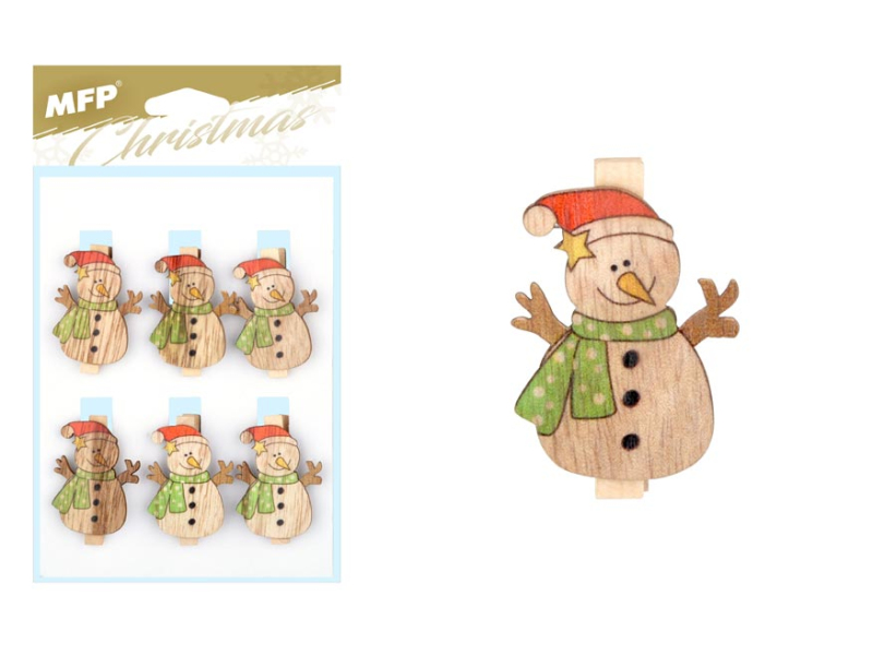 Vianočná, drevená dekorácia vyrezávaný snehuliak nalepený na štipcu, vďaka ktorému môžeme ozdobu pripnúť kamkoľvek. Plánujete si urobiť kreatívne pohodové popoludnie pred Vianocami a vyzdobiť si byt? Potom určite neváhajte kúpiť si tieto krásne drevené dekorácie, ktoré navodia príjemnú vianočnú atmosféru. Môžete ich použiť na ozdobenie stromčeka, na vianočný veniec alebo na prichytenie menovky na darček. Využitie je mnoho. Vyrobené z preglejky. BALENIE OBSAHUJE: - 6 ks štipcov (snehuliak) Balené v plastovom vrecku so závesom. Uvedená cena je za za 1 balenie.