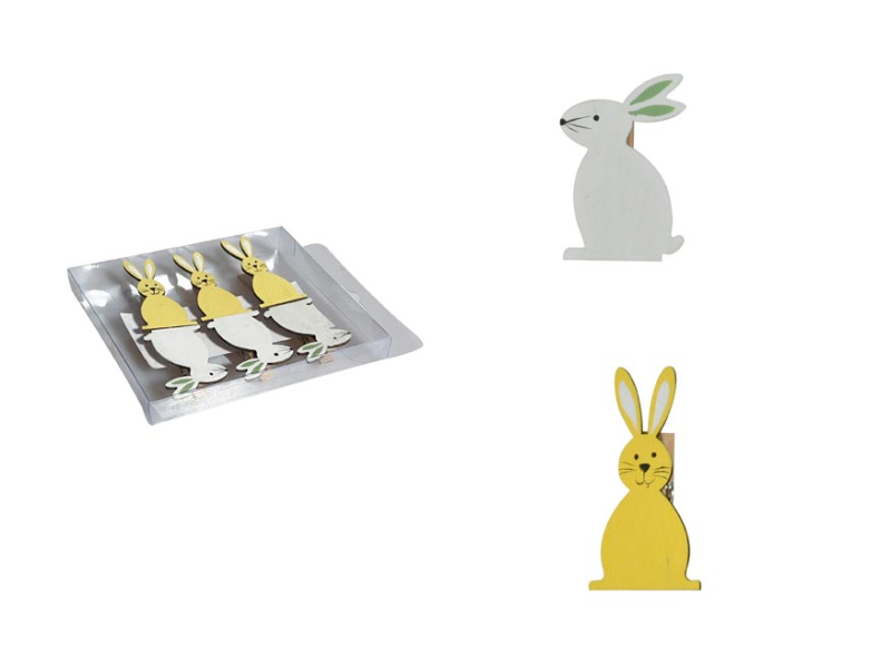 Štipce v dizajne drevených zajačikov, poslúži ako krásna dekorácia do exteriéru alebo na skrášlenie interiéru. BALENIE OBSAHUJE: - 6 ks štipcov (3 žlté zajace, 3 biele zajace) Veľkosť: 5 mm Balené v plastovej krabičke. Uvedená cena je za 1 balenie.