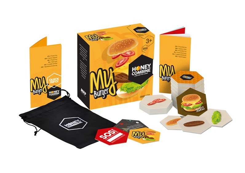 Zábavná stolová hra Honey Combine - MY BURGER Grilované mäso, plátok syra, ľadový šalát a čerstvé paradajky... Buď najrýchlejší a poskladaj svoj burger ako prvý! Použi na jeho prípravu všetky suroviny v správnom poradí a vychutnaj si kyslé tváre svojich súperov. Staň sa majstrom v príprave hamburgerov a otvor si svoje vlastné rýchle občerstvenie! Pravidlá hry: Do hry MY BURGER si každý hráč vyberie ako predlohu jednu zo štyroch kariet so svojim obľúbeným hamburgerom. Všetky karty so surovinami hráči premiešajú a rozmiestnia ich náhodne na hraciu plochu obrázkami nadol. Úlohou hráča je zostaviť z týchto kariet svoj hamburger od spodnej časti rozkrojenej žemle smerom nahor podľa predlohy. Po určení alebo vylosovaní poradia hráčov v hre obráti prvý hráč ľubovoľnú kartu tak, aby ju videli aj ostatní. Pokiaľ nebude na tejto karte obrázok spodnej časti rozkrojenej žemle, vráti hráč kartu späť obrázkom nadol a v hre pokračuje jeho súper. Keď sa hráčovi po obrátení karty podarí nájsť spodnú časť rozkrojenej žemle, odoberie si túto kartu a pokračuje v ťahu hľadaním ďalšej suroviny v poradí. Tento hráč pokračuje v hre tak dlho, pokiaľ sa mu darí nachádzať obrázky surovín podľa poradia vrstiev na predlohe. Pokiaľ hráč obráti kartu so surovinou, ktorú nemôže pre nasledujúcu vrstvu použiť, vráti ju na rovnaké miesto obrázkom nadol a v hre pokračuje jeho súper. Víťazom hry MY BURGER sa stáva hráč, ktorý ako prvý zostaví svoj hamburger podľa predlohy a dodrží správne poradie jeho vrstiev. Vhodné pre deti od 3 rokov. Nebezpečenstvo vdýchnutia a prehĺtnutia malých častí. Stolová hra pre trénovanie pamäte a postrehu pre dvoch až štyroch hráčov. Balenie obsahuje 28 hracích kariet, pravidlá hry, textilné vrecúško a servisný SOS kód. Uvedená cena je za 1 ks. Dodávame v krabičke.