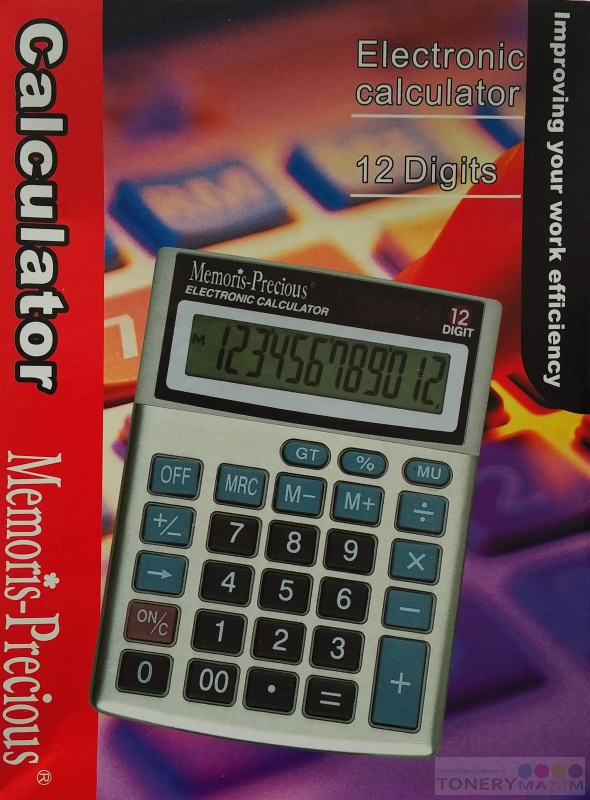 Stolová kalkulačka Memoris s dvanásťmiestnym displayom, veľkými plastovými tlačidlami a dvomi zdrojmi napájania (batéria, solárna energia. Funkcie: pamäť, výpočet percent, tlačidlo 00, desatinné nastavenie, automatické vypnutie.