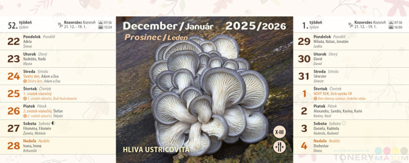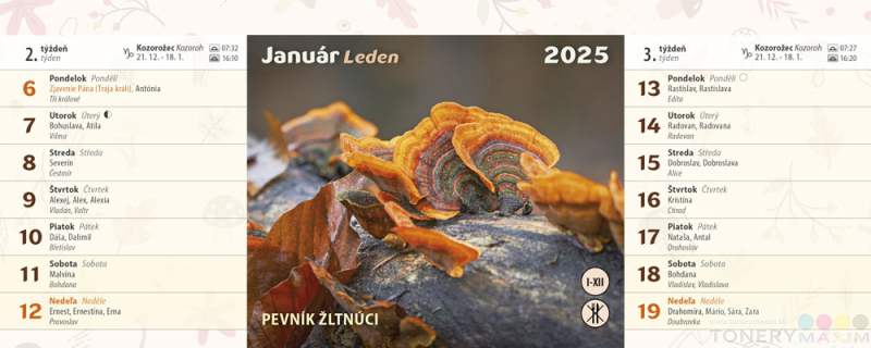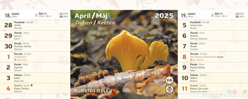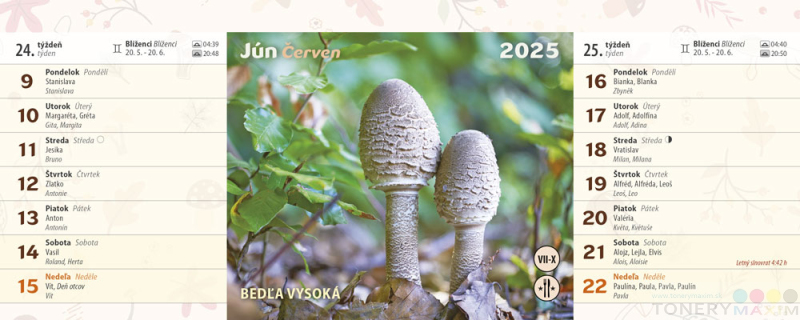 Úžasný hubársky dvojtýždňový stolový kalendár vám predstaví krásne hubárske úlovky zo slovenských lesov a lúk aj s názvom huby, piktogramom – jedlá, nejedlá, jedovatá huba a časom ich výskytu. Nájdete v ňom informácie o východe, západe Slnka, znamenia zverokruhu, slovenské a české mená a štátne sviatky oboch krajín. A nezabudnite, pri zbere húb sa poraďte so skúseným hubárom. Nezbierajte huby, ktoré nepoznáte.