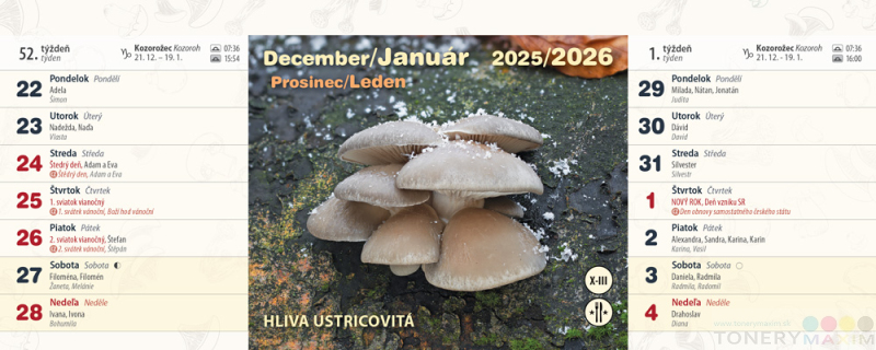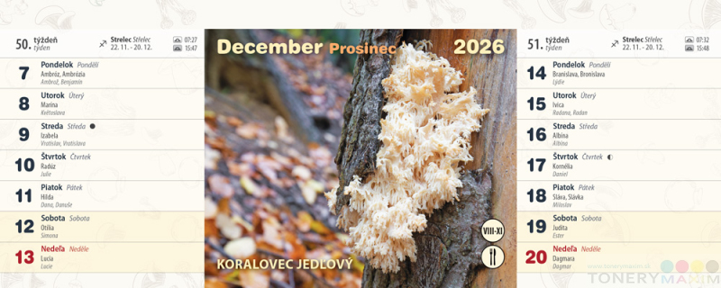 Úžasný hubársky dvojtýždňový stolový kalendár vám predstaví krásne hubárske úlovky zo slovenských lesov a lúk aj s názvom huby, piktogramom – jedlá, nejedlá, jedovatá huba a časom ich výskytu. Nájdete v ňom informácie o východe, západe Slnka, znamenia zverokruhu, slovenské a české mená a štátne sviatky oboch krajín. A nezabudnite, pri zbere húb sa poraďte so skúseným hubárom. Nezbierajte huby, ktoré nepoznáte.