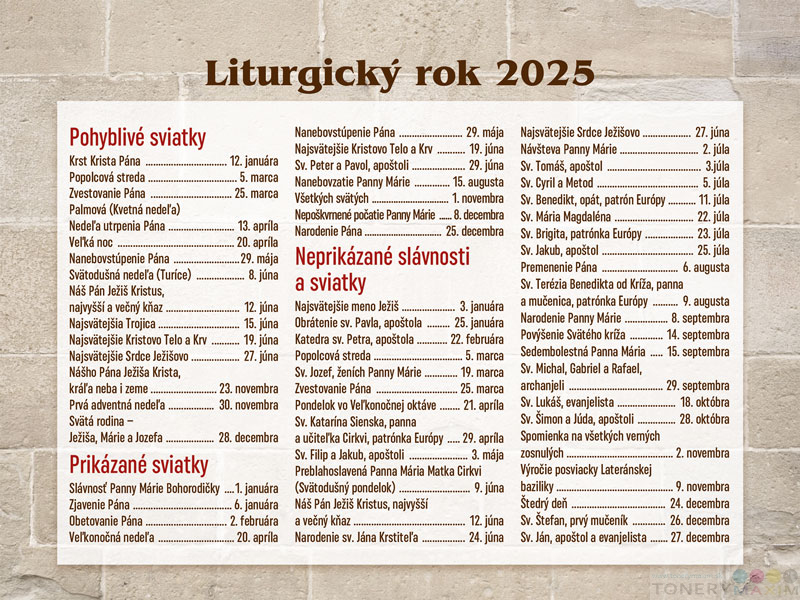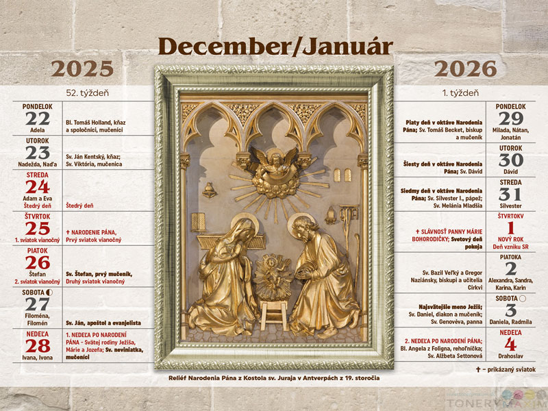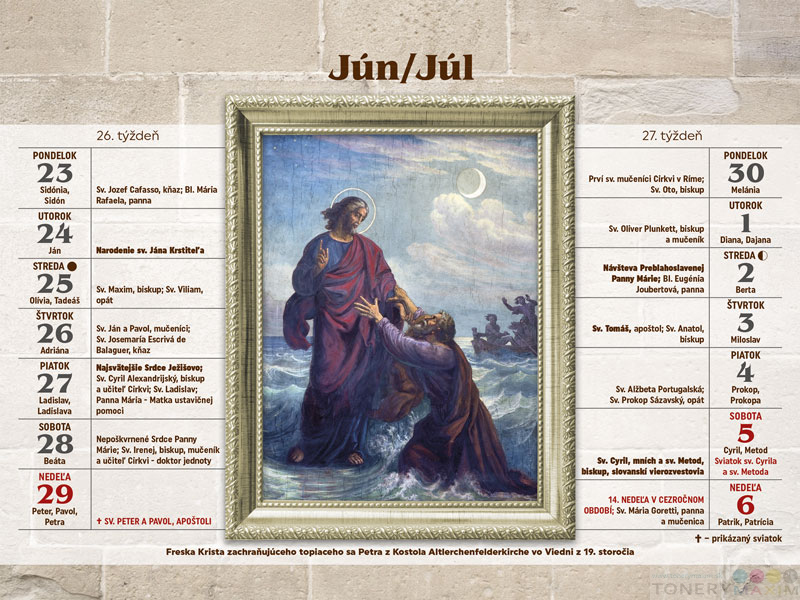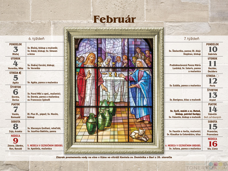 Stolový dvojtýždňový kalendár s náboženskou tematikou zachytenou na krásnych maľbách, mozaikách, reliéfoch a freskách, od slávnych i neznámych autorov, s popisom zobrazenia. Obsahuje bohaté cirkevné a svetské kalendárium. Nechýbajú slovenské mená a štátne sviatky.