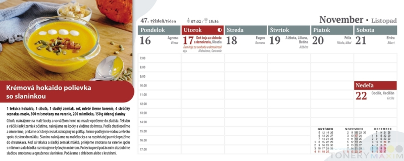 Skvelou inšpiráciou na prípravu chutných, nenáročných jedál je kalendár Kuchárka. Stolový týždňový stĺpcový kalendár s obrázkami a receptami jedál, doplnený o fázy Mesiaca, východy a západy Slnka, so slovenskými a českými menami (plus netradičné mená), vyznačnými štátnymi sviatkami oboch krajín aj susediacich krajín EÚ. Prajeme Dobrú chuť!