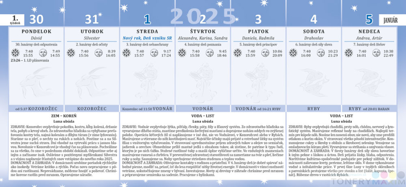 Lunárny kalendár je tým najlepším pomocníkom a radcom, kedy a ako sa starať o svoje zdravie, domácnosť či záhradu. Naučí vás, ako využívať silu Mesiaca vo svoj prospech. Týždňový stĺpcový kalendár obsahuje východy a západy Slnka a Mesiaca, znamenia zverokruhu a slovenské mená a sviatky.