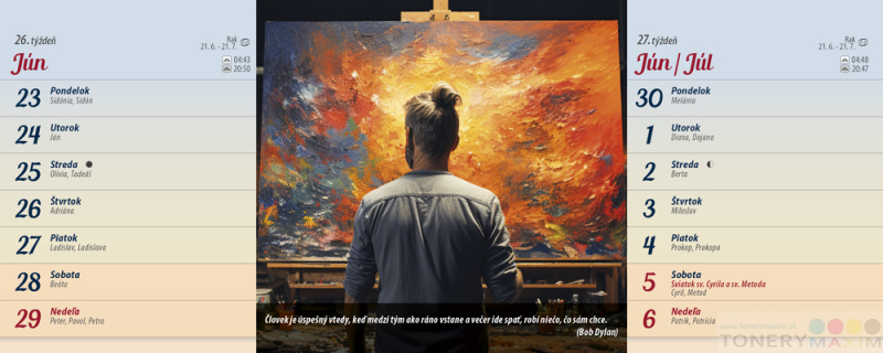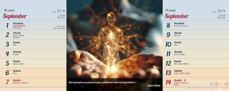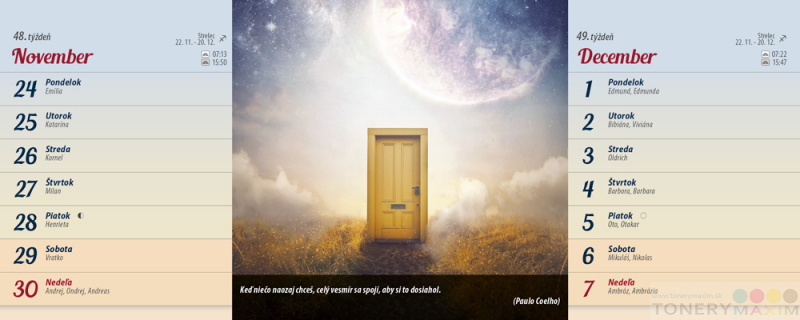 Motivačný kalendár je pre všetkých, ktorí sa radi zamyslia a spomalia v tomto uponáhľanom svete. Dvojtýždňový stolový kalendár s citátmi, so slovenskými menami, štátnymi sviatkami, východmi a západmi Slnka, znameniami zverokruhu a fázami Mesiaca v riadkovom kalendáriu.
