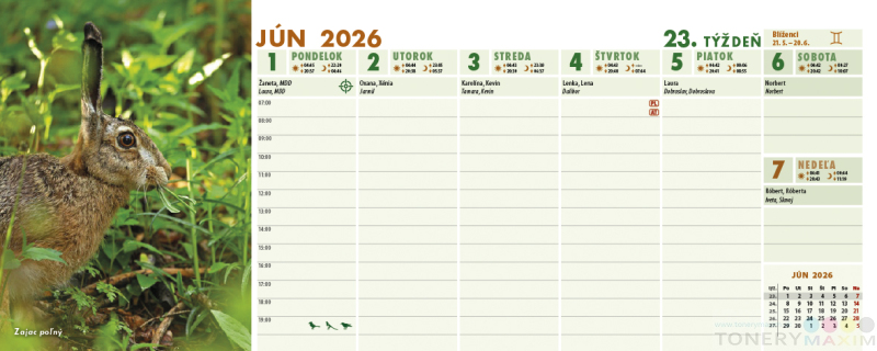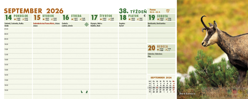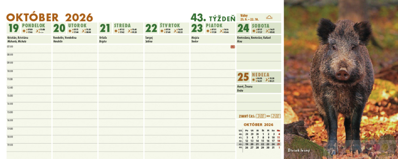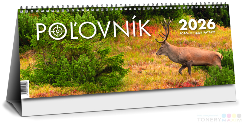 Stolový týždňový kalendár Poľovník s originálnymi fotografiami divých zvierat je doplnený piktogramami o love poľovnej zvery. Stĺpcové kalendárium s hodinovým delením, fázami Mesiaca, východmi a západmi Slnka i Mesiaca obsahuje slovenské aj české mená, štátne sviatky aj susediacich krajín EÚ. Na predných stránkach nájdete prehľadný zoznam lovu zvery na aktuálny rok, zoznam sviatkov všetkých krajín EÚ a plánovací kalendár (fond pracovného času).