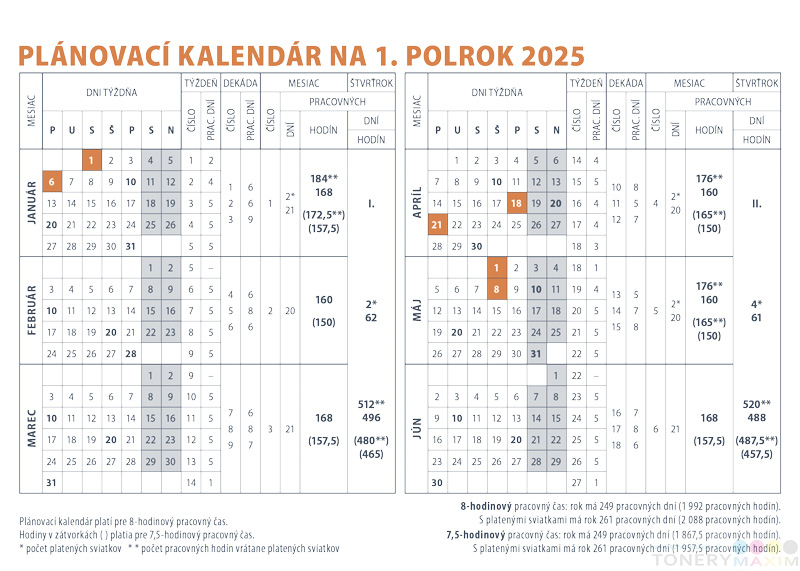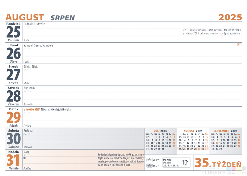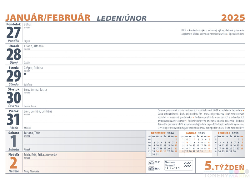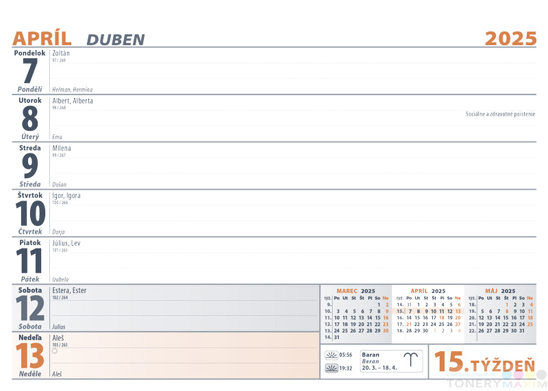 Variant pracovného kalendára s riadkovým kalendáriom. Obsah je identický s veľkým pracovným kalendárom, vrátane daňových pripomienok s prehľadnými mesačnými kalendáriami, fázami Mesiaca, východmi a západmi Slnka, štátnymi sviatkami všetkých krajín EÚ, školskými prázdninami, znameniami zverokruhu, slovenskými a českými menami (plus netradičné mená).